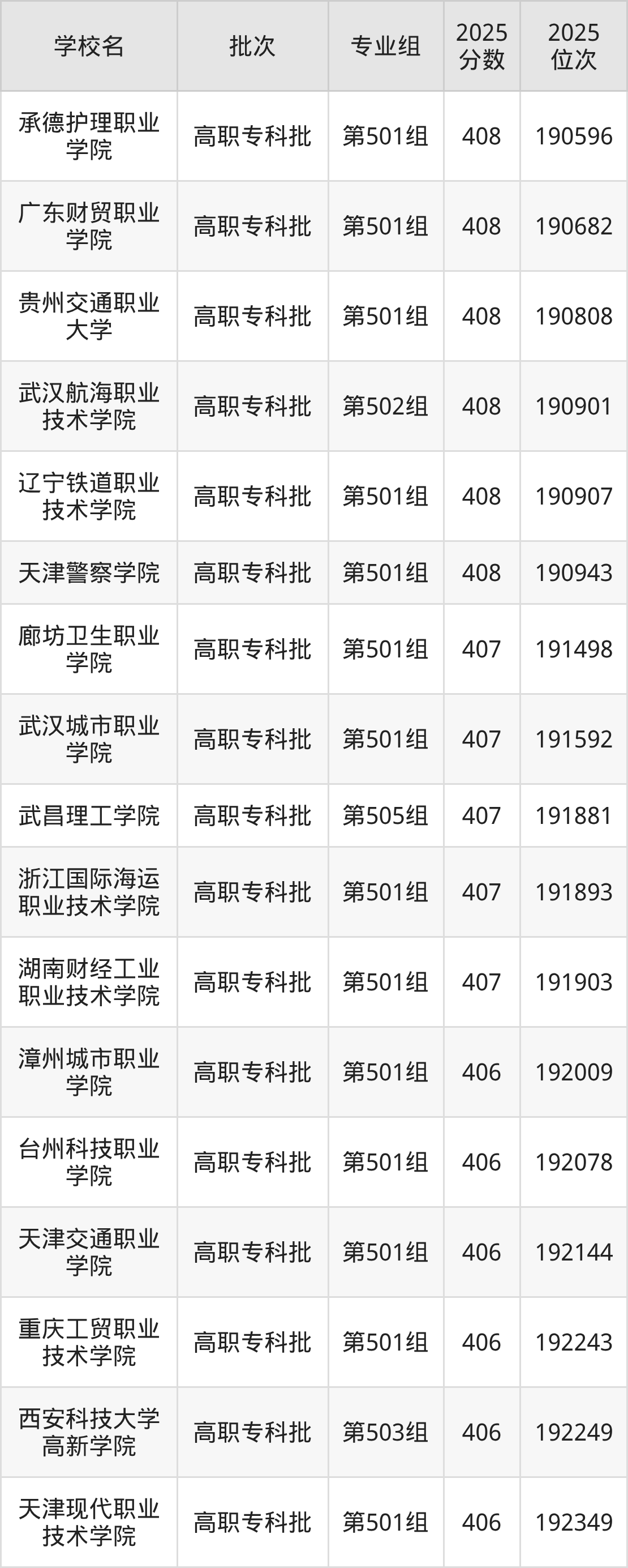 另外录取位次低于该区间(较稳妥)的有漳州城市职业学院第501组(192009名)、台州科技职业学院第501组(192078名)等;录取位次高于该区间(可冲)的有天津警察学院第501组(190943名)、辽宁铁道职业技术学院第501组(190907名)等。