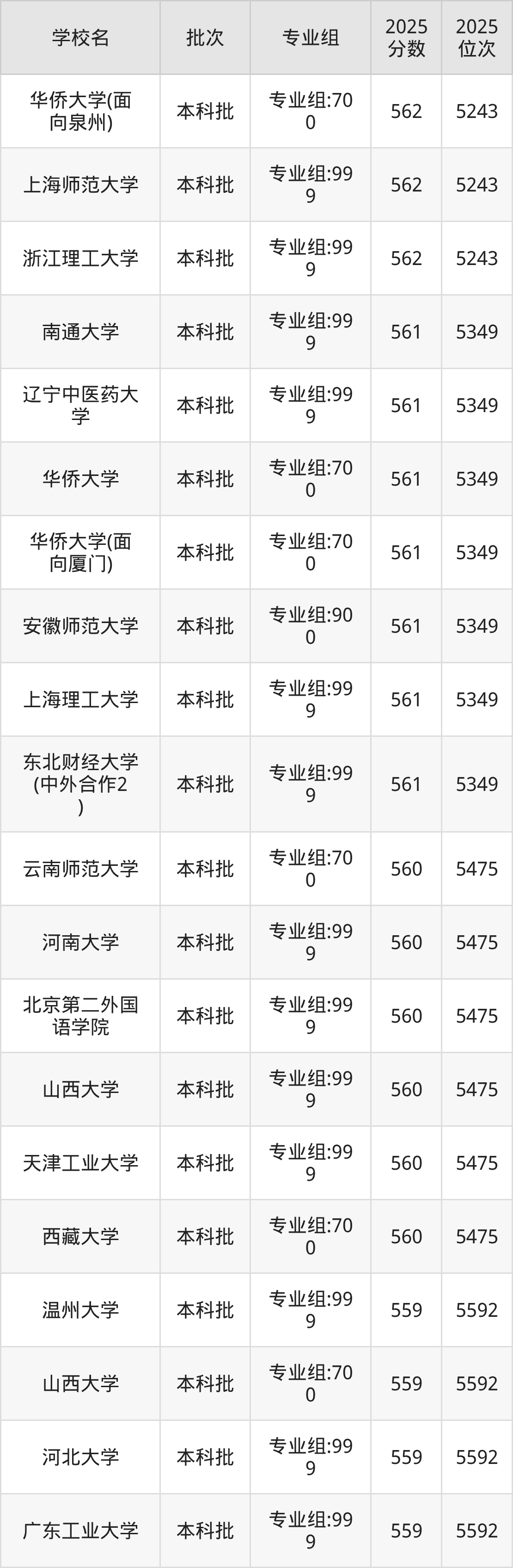 2025年福建高考历史类557分(5721名~5853名)能上的大学有长江大学专业组:999、贵州中医药大学专业组:999、江西师范大学专业组:999、宁波诺丁汉大学专业组:999等。