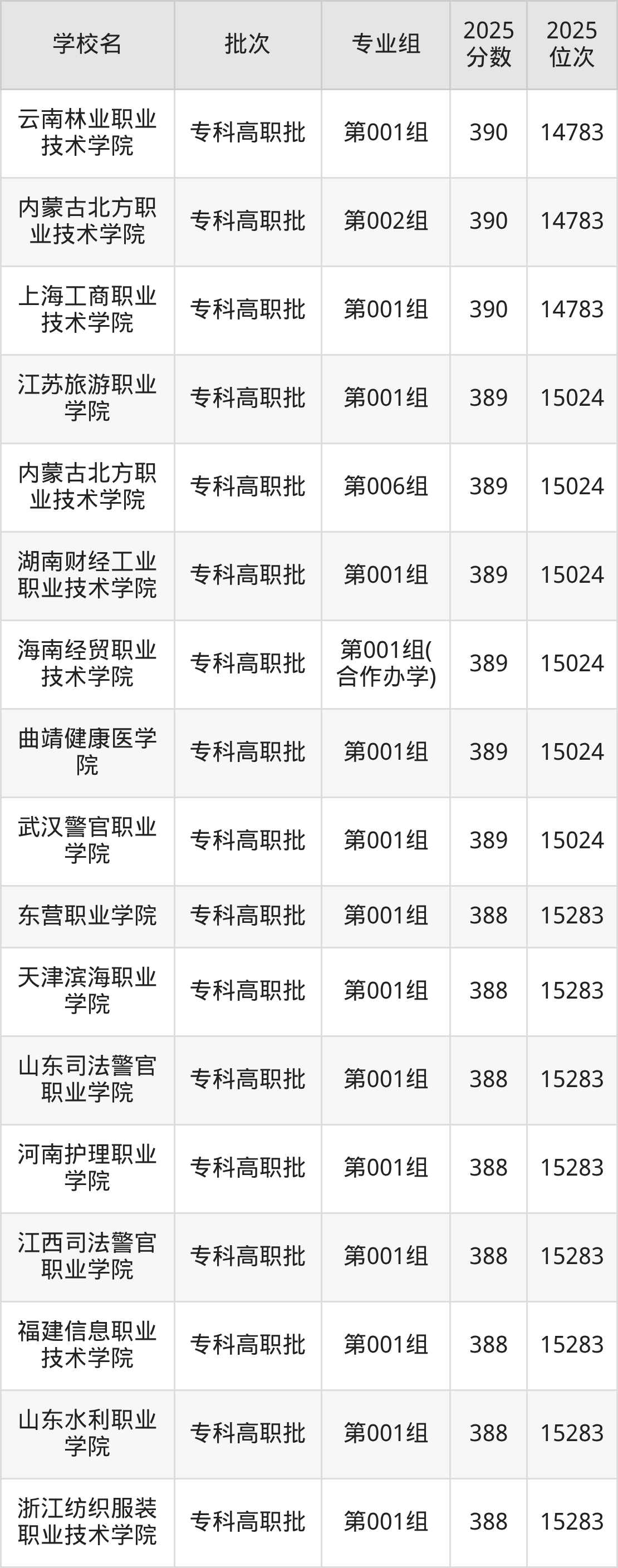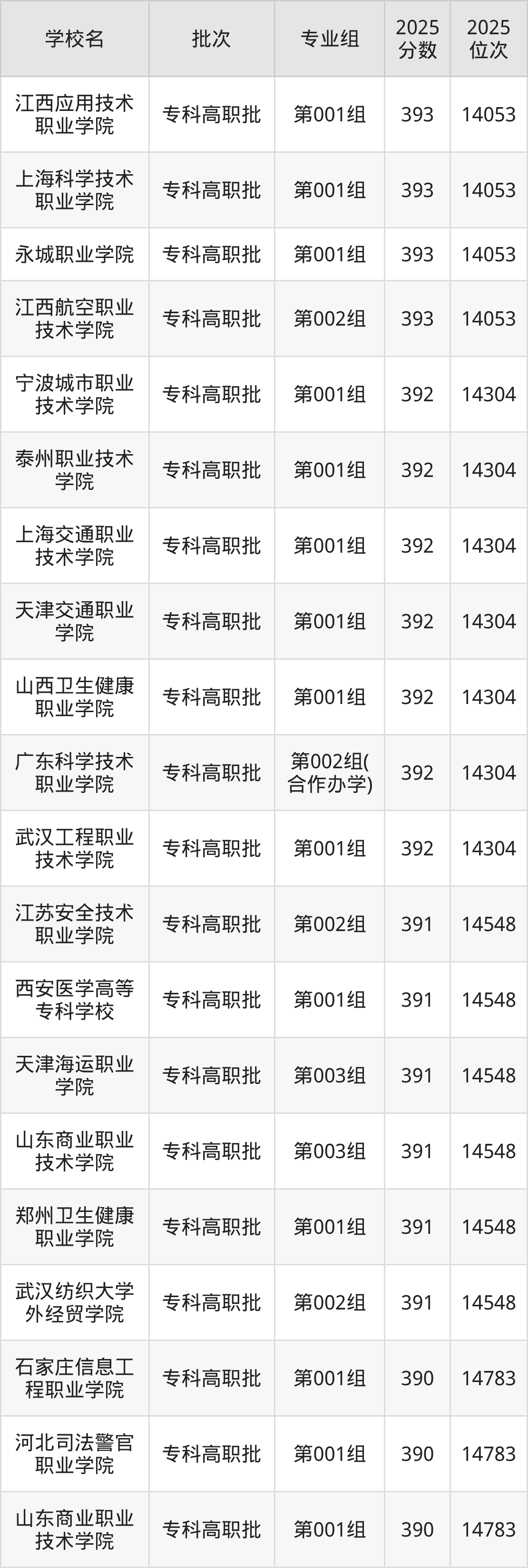 2025年山西高考历史类390分(14549名~14783名)能上的大学有石家庄信息工程职业学院第001组、河北司法警官职业学院第001组、内蒙古北方职业技术学院第002组、上海工商职业技术学院第001组等。