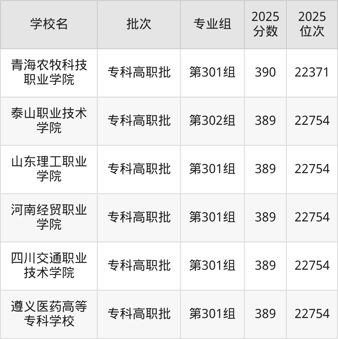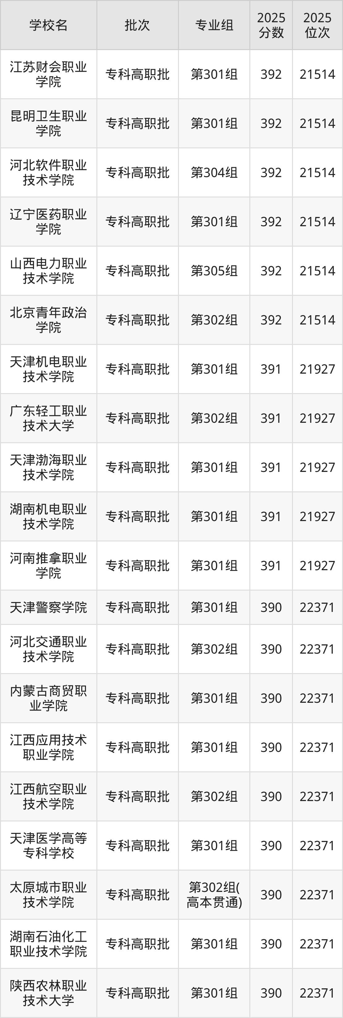 2025年山西高考物理类390分(21928名~22371名)能上的大学有天津医学高等专科学校第301组、天津警察学院第301组、河北交通职业技术学院第302组、内蒙古商贸职业学院第301组等。