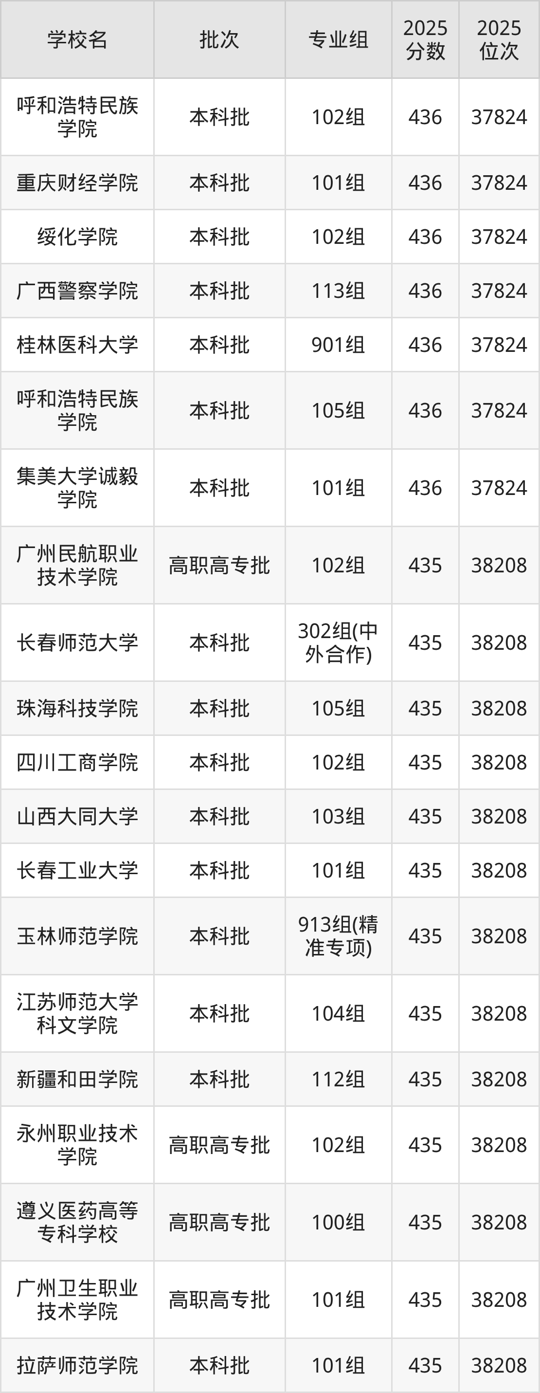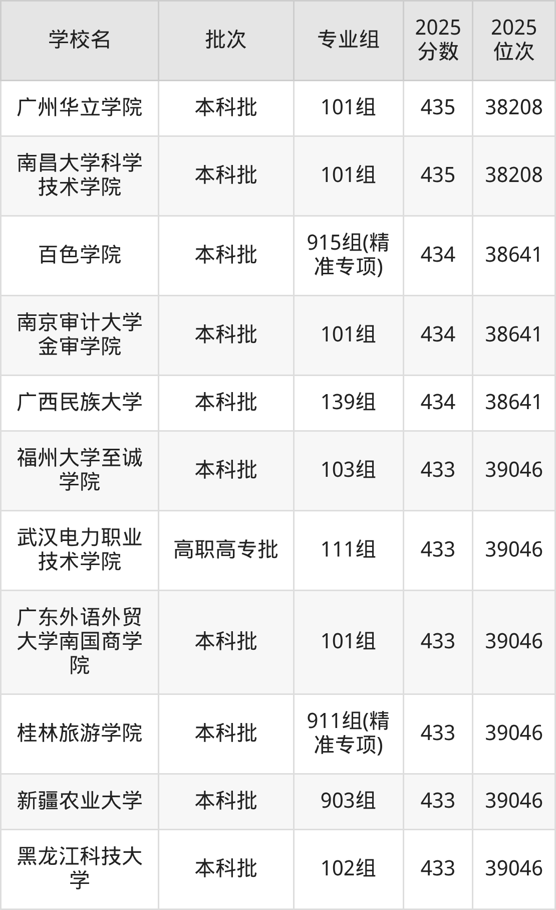 2025年广西高考历史类434分(38209名~38641名)能上的大学有广西民族大学139组、百色学院915组(精准专项)、南京审计大学金审学院101组。