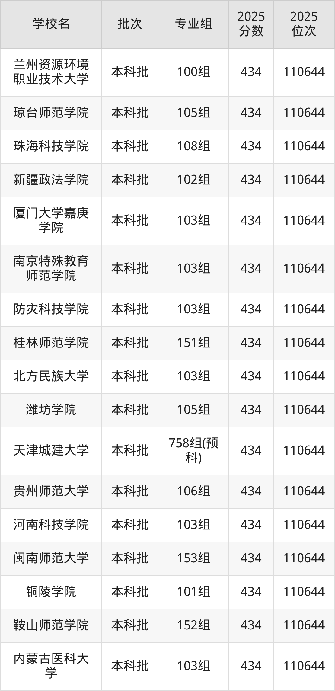 2025年广西高考物理类434分(109668名~110644名)能上的大学有内蒙古医科大学103组、鞍山师范学院152组、铜陵学院101组、闽南师范大学153组等。