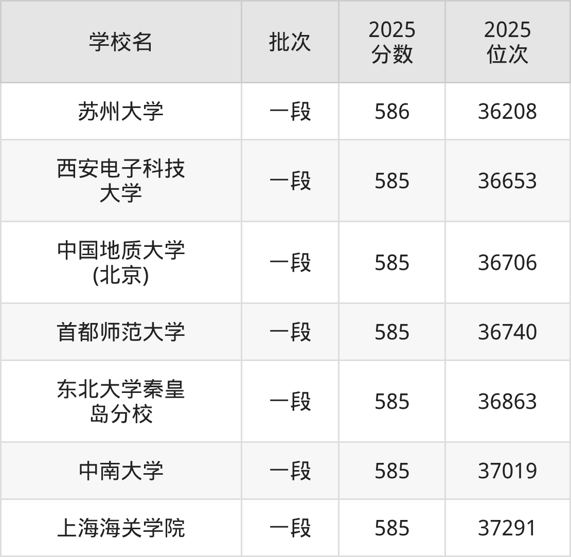 2025年山东高考585分(36511名~37499名)能上的大学有上海海关学院、中国地质大学(北京)、西安电子科技大学、首都师范大学等。