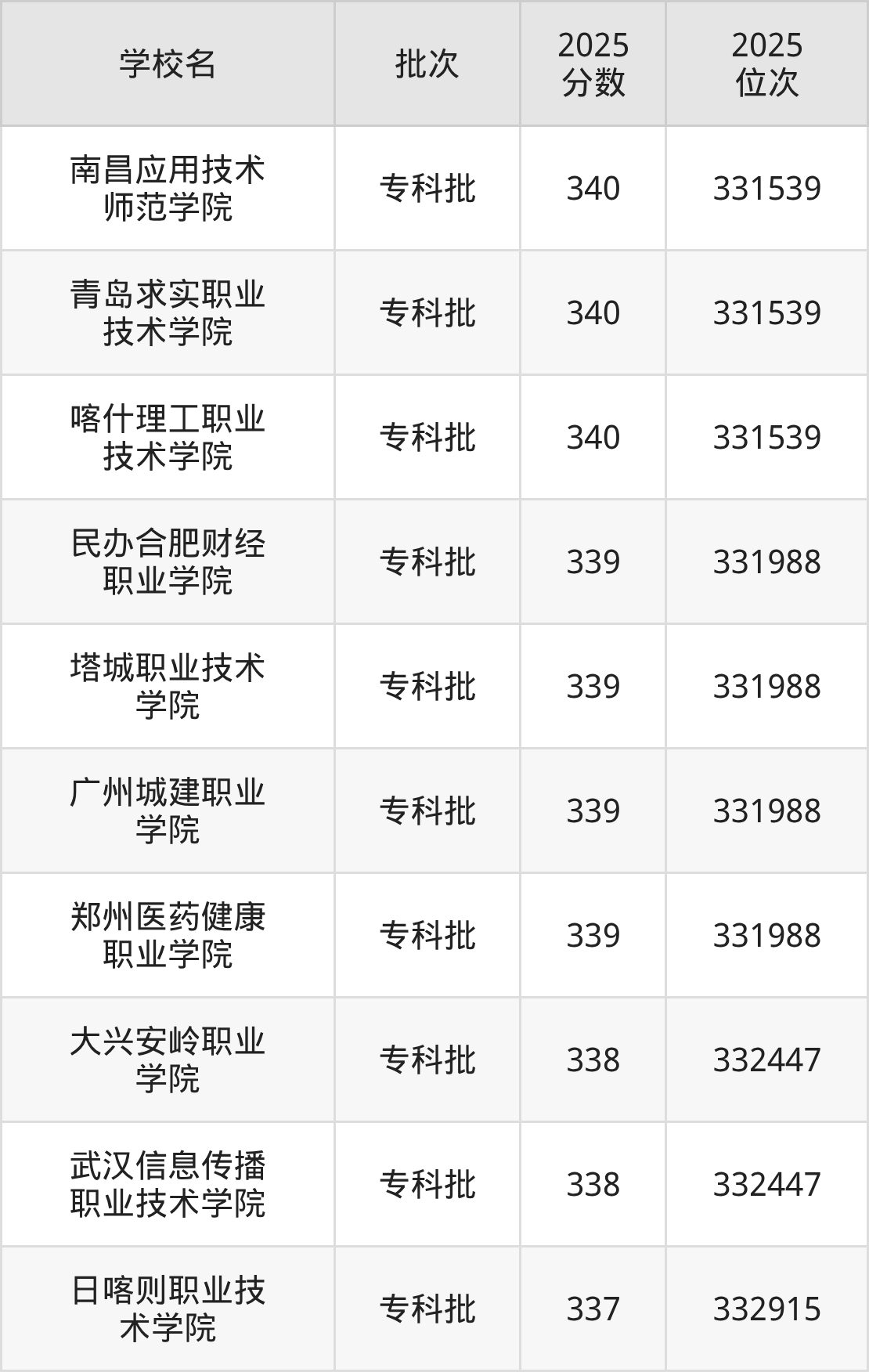 另外录取位次低于该区间(较稳妥)的有日喀则职业技术学院(332915名)、新疆建设职业技术学院(333371名)等;录取位次高于该区间(可冲)的有郑州医药健康职业学院(331988名)、广州城建职业学院(331988名)等。