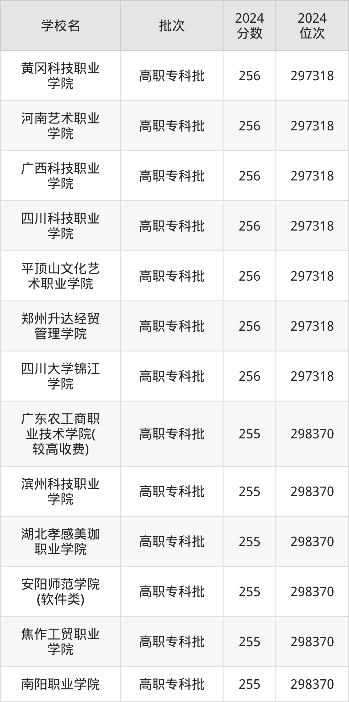 河南高考255分:文科排名298370位、理科排名513769位。该分数位次对应能上的大学文科有南阳职业学院、焦作工贸职业学院;理科有郑州旅游职业学院、焦作大学,更多名单如下文所示,2025届考生可参考。