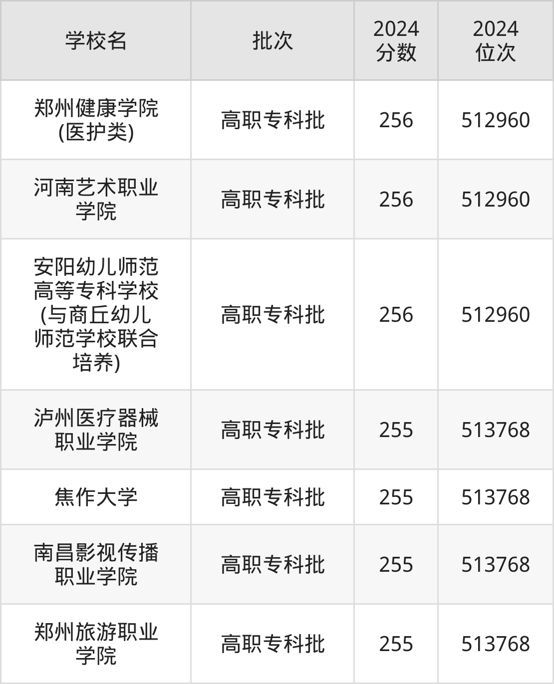 2024年河南高考理科255分(512962名~513769名)能上的大学有郑州旅游职业学院、焦作大学、南昌影视传播职业学院、泸州医疗器械职业学院。