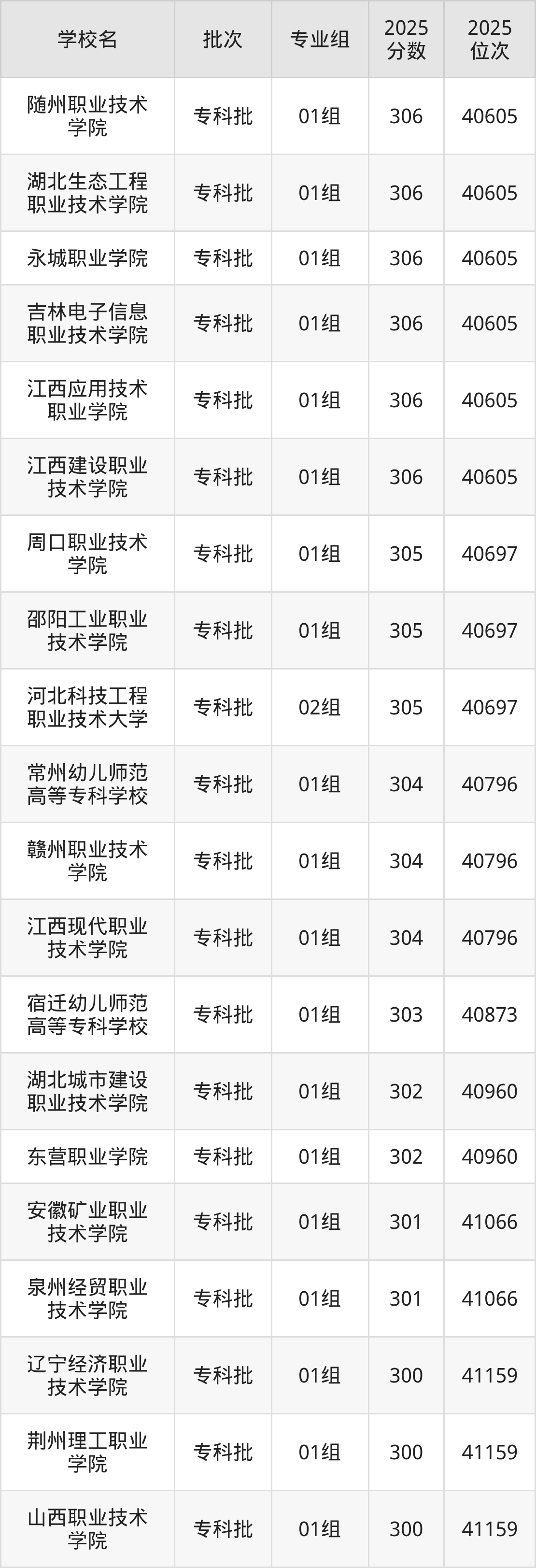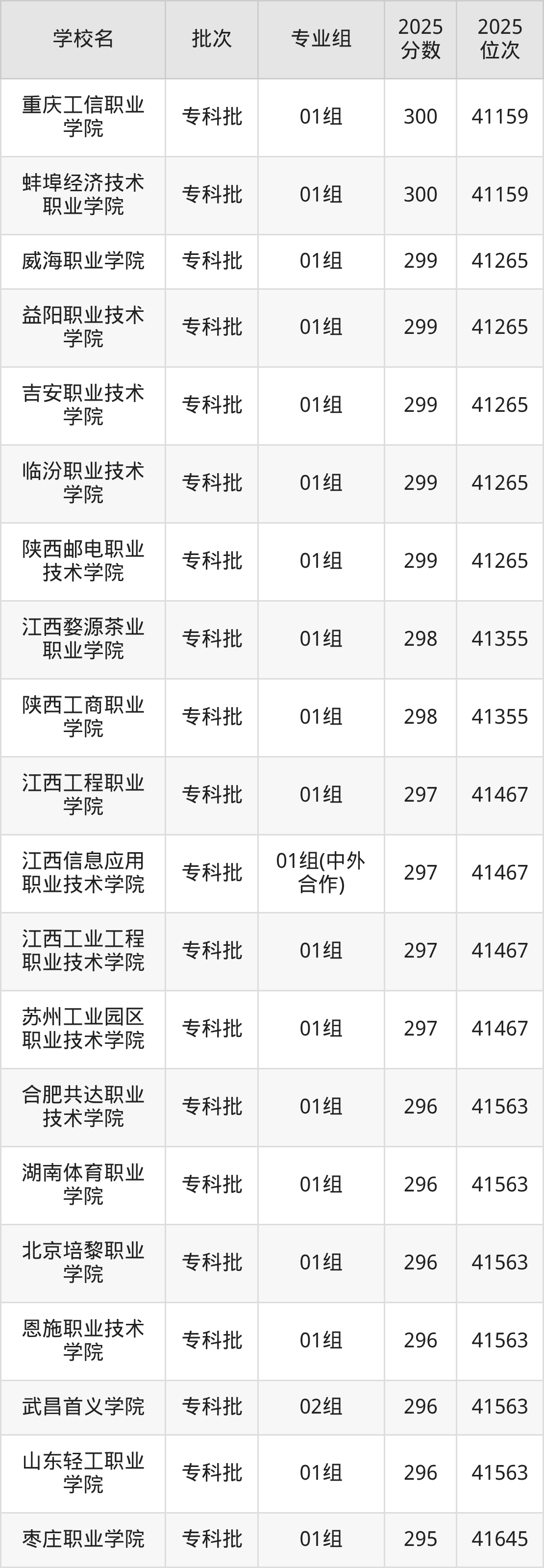 2025年江苏高考历史类300分(41067名~41159名)能上的大学有山西职业技术学院01组、辽宁经济职业技术学院01组、荆州理工职业学院01组、重庆工信职业学院01组等。