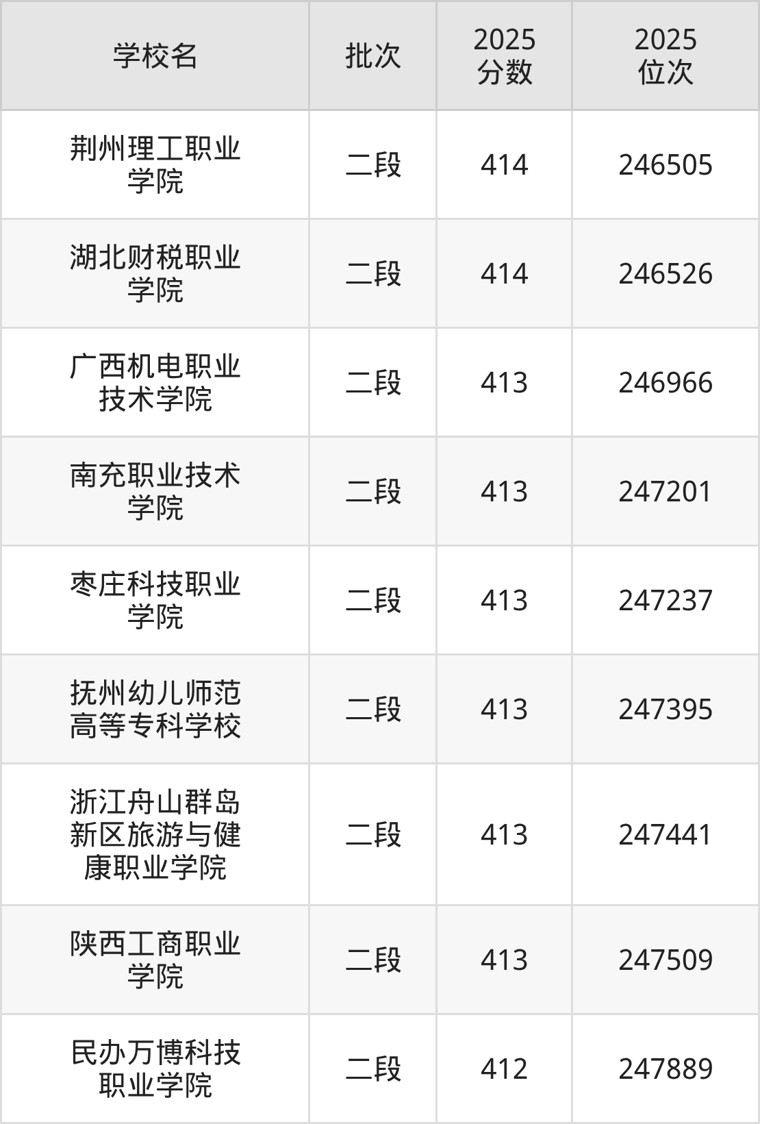 2025年浙江高考413分(246945名~247511名)能上的大学有浙江舟山群岛新区旅游与健康职业学院、陕西工商职业学院、南充职业技术学院、抚州幼儿师范高等专科学校等。