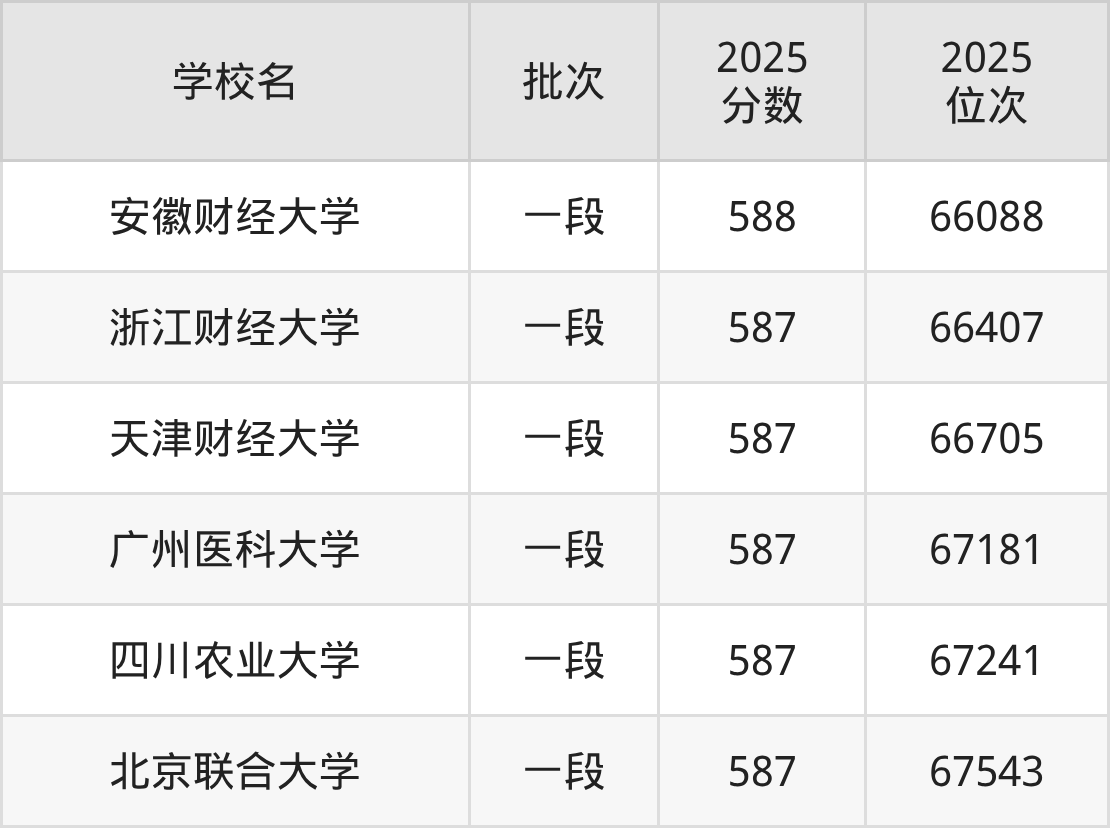 2025年浙江高考587分(66346名~67576名)能上的大学有天津财经大学、四川农业大学、北京联合大学、浙江财经大学等。