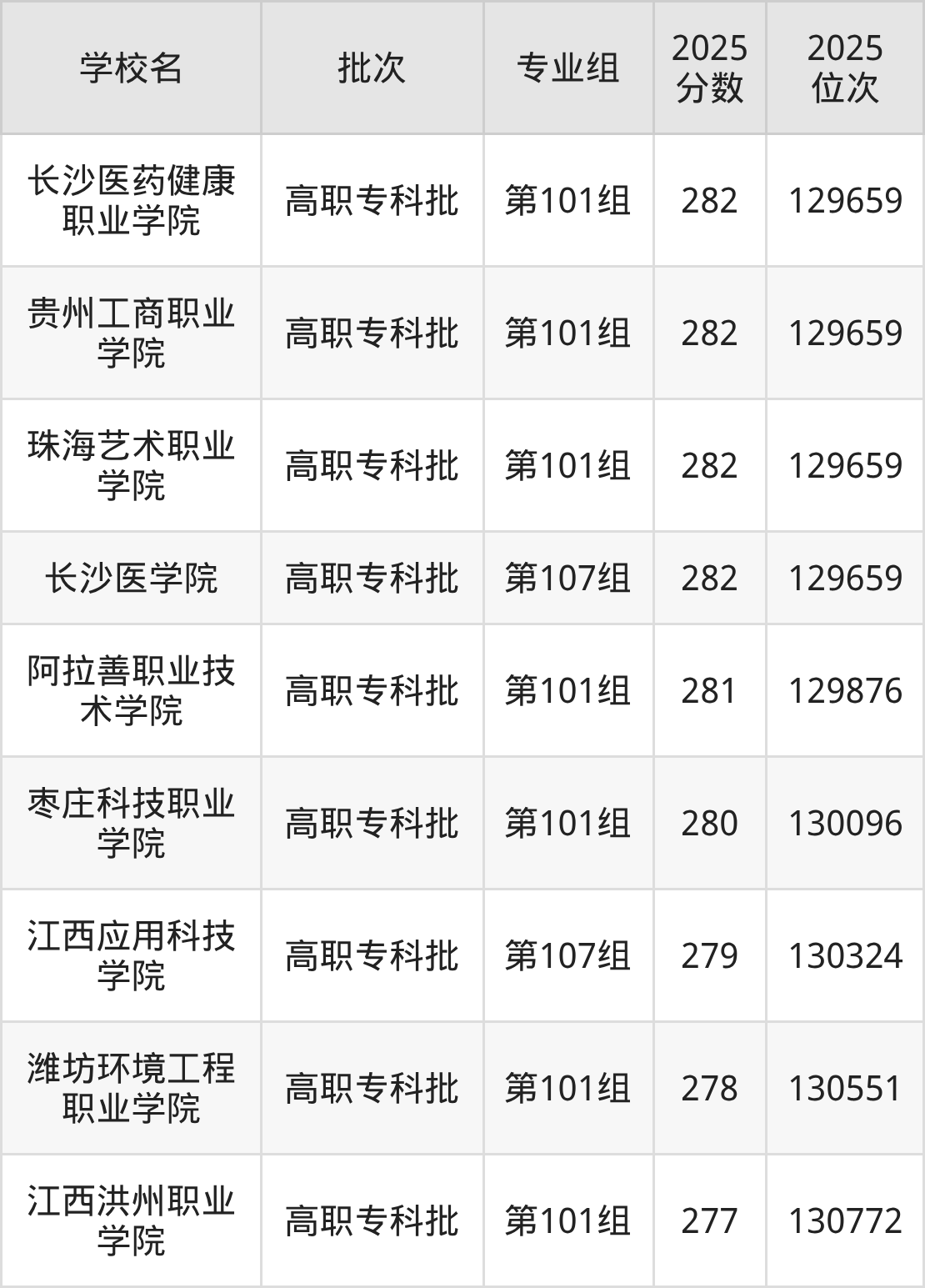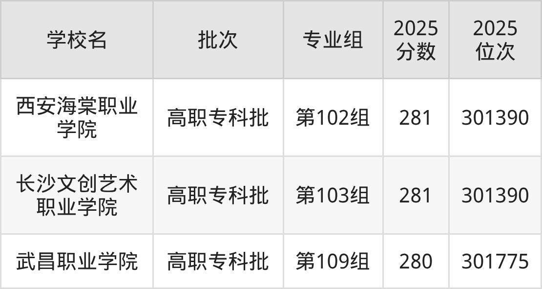 2025年湖南高考物理类279分(301776名~302124名)录取位次低于该区间(较稳妥)的有南阳职业学院第102组(302871名)、黄冈科技职业学院第102组(303214名)等;录取位次高于该区间(可冲)的有武昌职业学院第109组(301775名)、长沙文创艺术职业学院第103组(301390名)等。