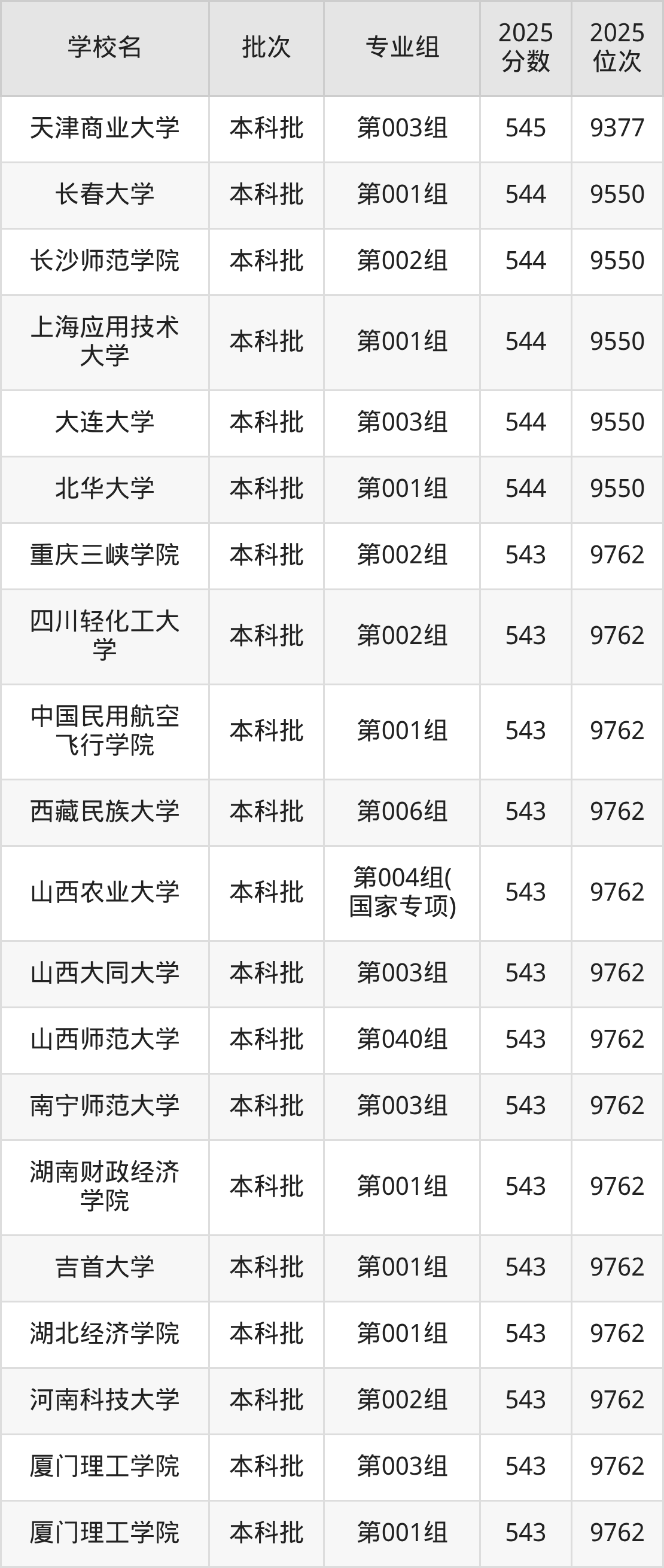 2025年山西高考历史类544分(9378名~9550名)能上的大学有大连大学第003组、北华大学第001组、长春大学第001组、上海应用技术大学第001组等。