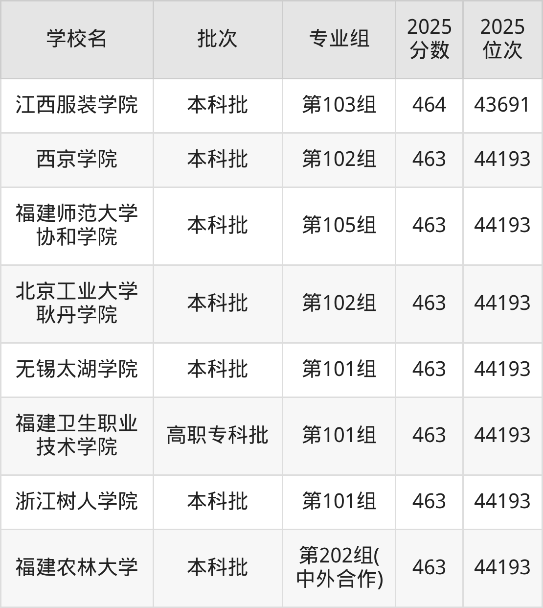 2025年湖南高考历史类463分(43692名~44193名)能上的大学有北京工业大学耿丹学院第102组、无锡太湖学院第101组、浙江树人学院第101组、福建农林大学第202组(中外合作)等。
