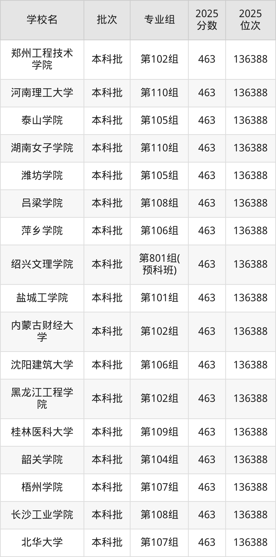 2025年湖南高考物理类463分(135110名~136388名)能上的大学有北京工业大学耿丹学院第103组、保定学院第106组、石家庄学院第106组、吕梁学院第108组等。