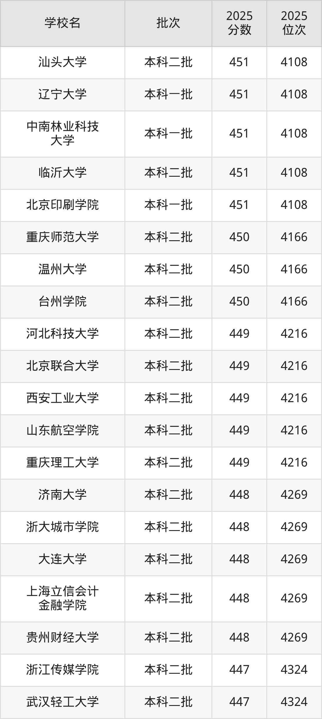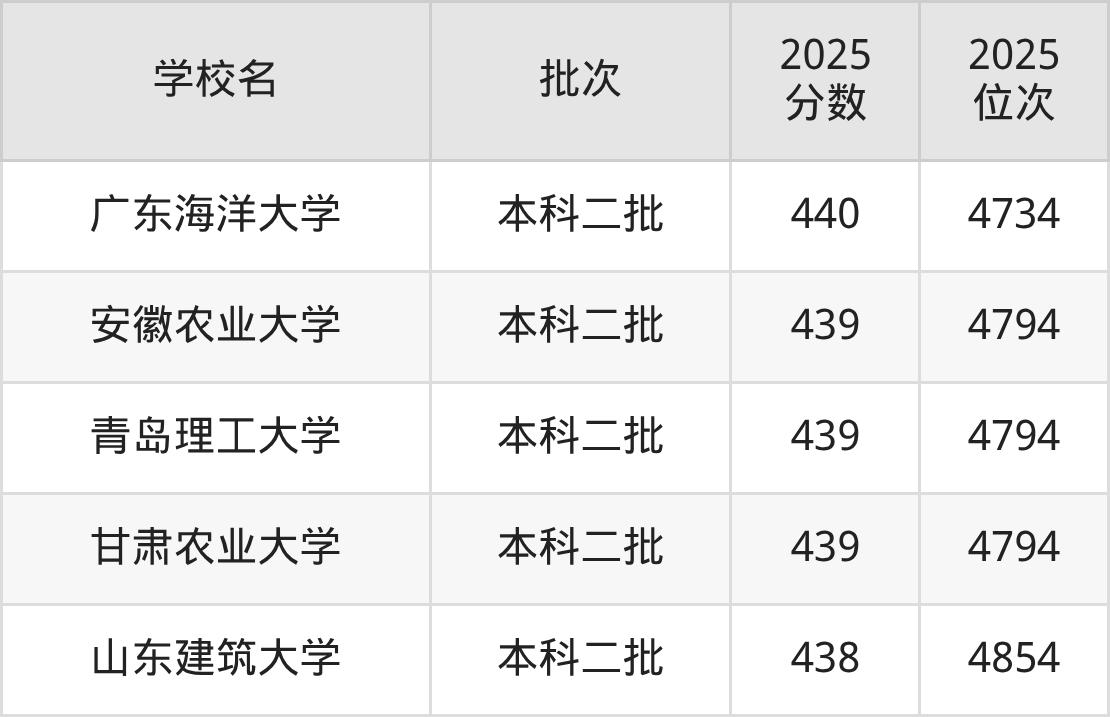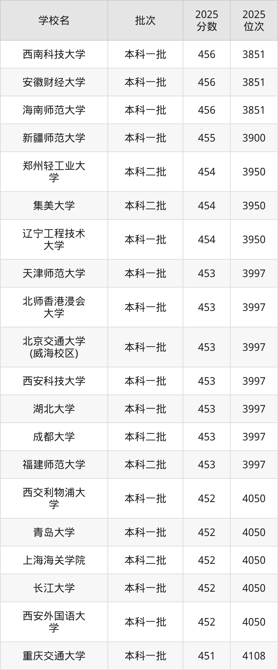 这些都是2026年高考文科4325名~4376名考生可以报考的大学,更多学校名单如下表所示: