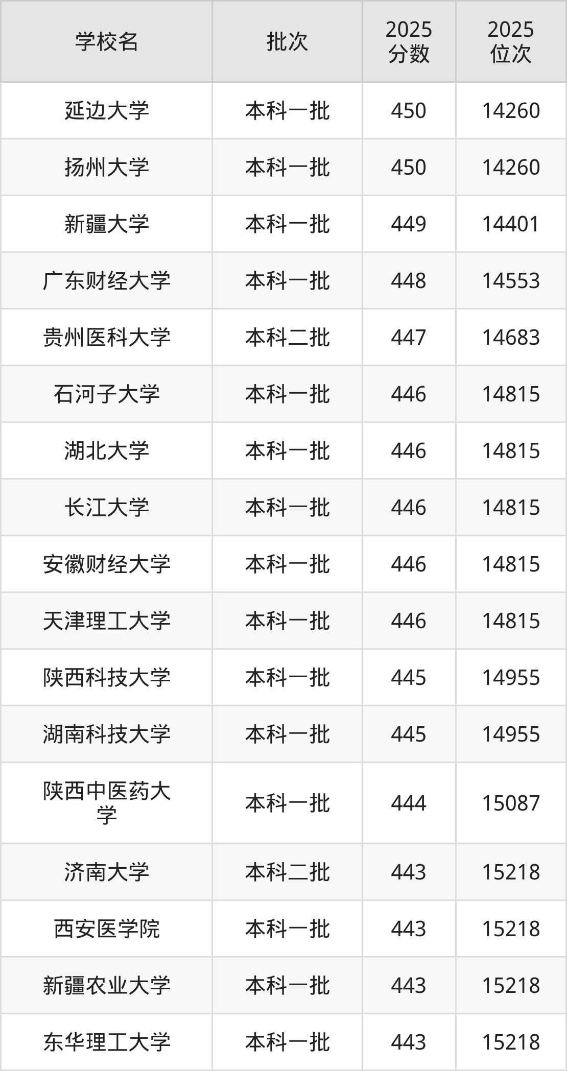 2025年新疆高考理科446分(14684名~14815名)能上的大学有天津理工大学、安徽财经大学、长江大学、湖北大学等。
