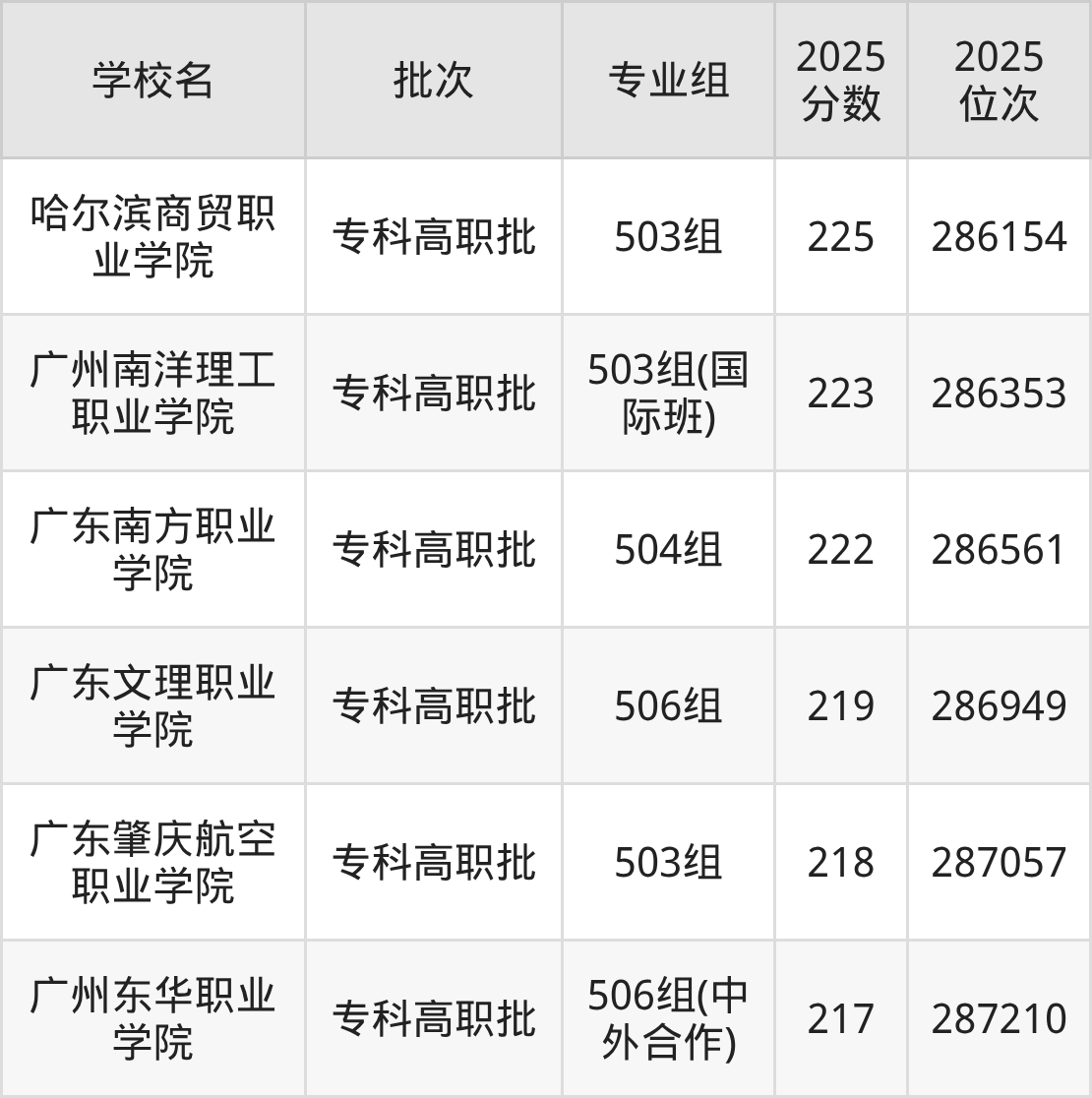 2025年广东高考历史类221分(286584名~286744名)录取位次低于该区间(较稳妥)的有广东文理职业学院506组(286949名)、广东肇庆航空职业学院503组(287057名)等;录取位次高于该区间(可冲)的有广东南方职业学院504组(286561名)、广州南洋理工职业学院503组(国际班)(286353名)等。