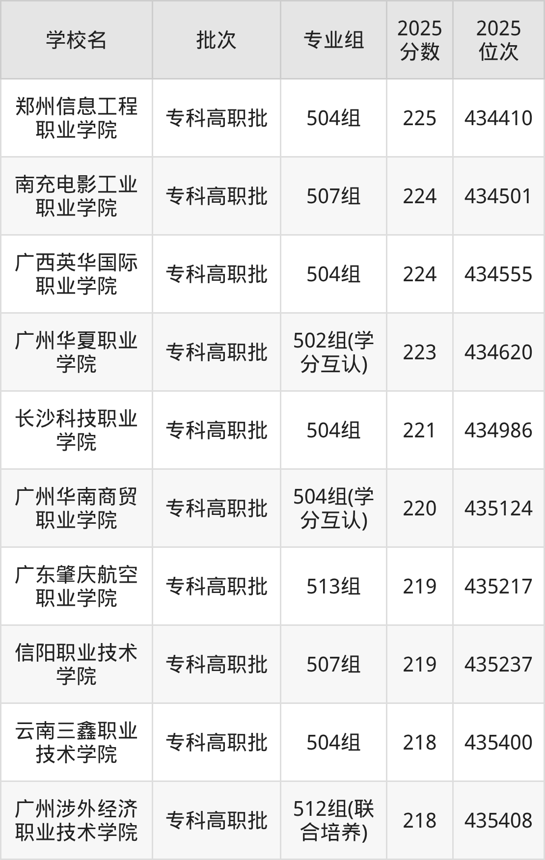 另外录取位次低于该区间(较稳妥)的有广州华南商贸职业学院504组(学分互认)(435124名)、广东肇庆航空职业学院513组(435217名)等;录取位次高于该区间(可冲)的有广州华夏职业学院502组(学分互认)(434620名)、广西英华国际职业学院504组(434555名)等。