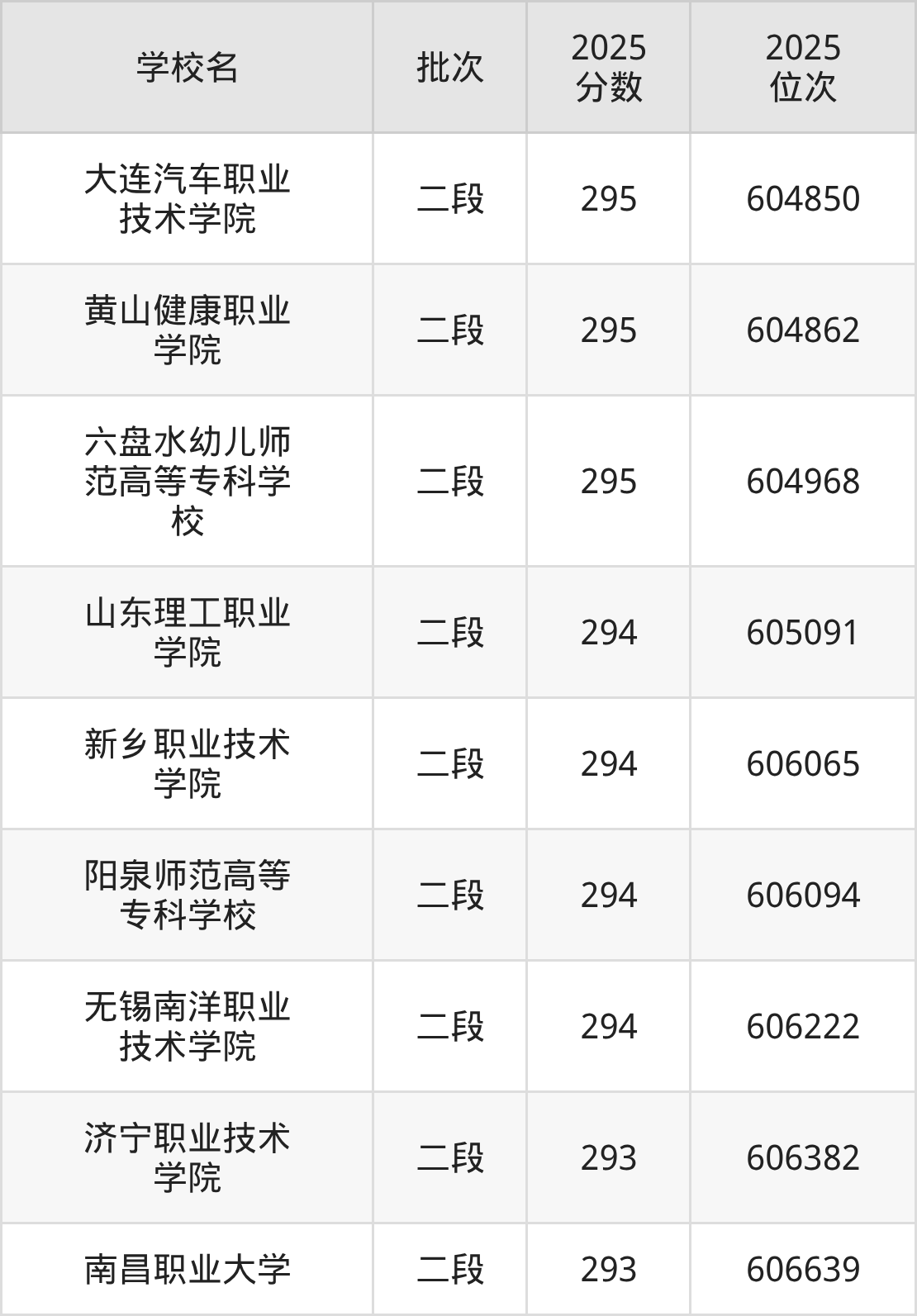 2025年山东高考294分(605027名~606299名)能上的大学有无锡南洋职业技术学院、山东理工职业学院、新乡职业技术学院、阳泉师范高等专科学校。