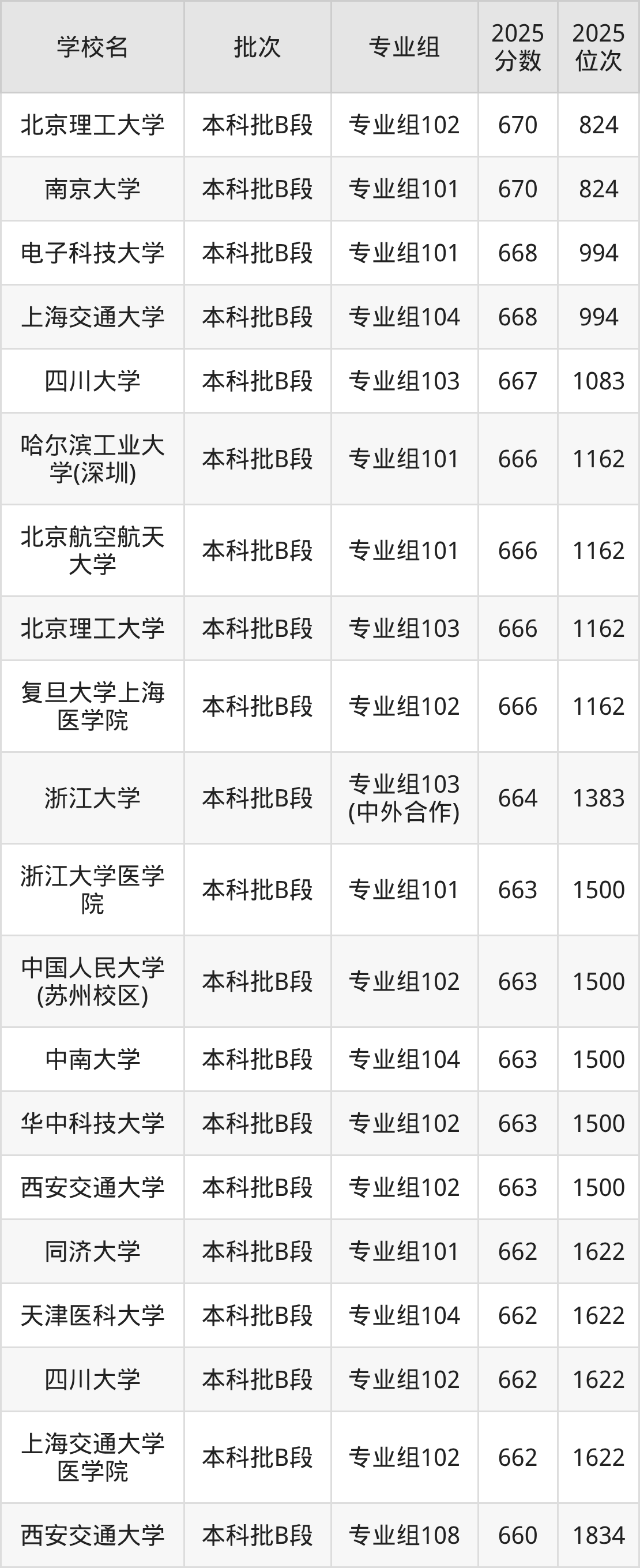 2025年四川高考历史类664分(30名)录取位次低于该区间(较稳妥)的有北京大学专业组101(37名)、上海交通大学专业组101(76名)等;录取位次高于该区间(可冲)的有清华大学专业组101(15名)。