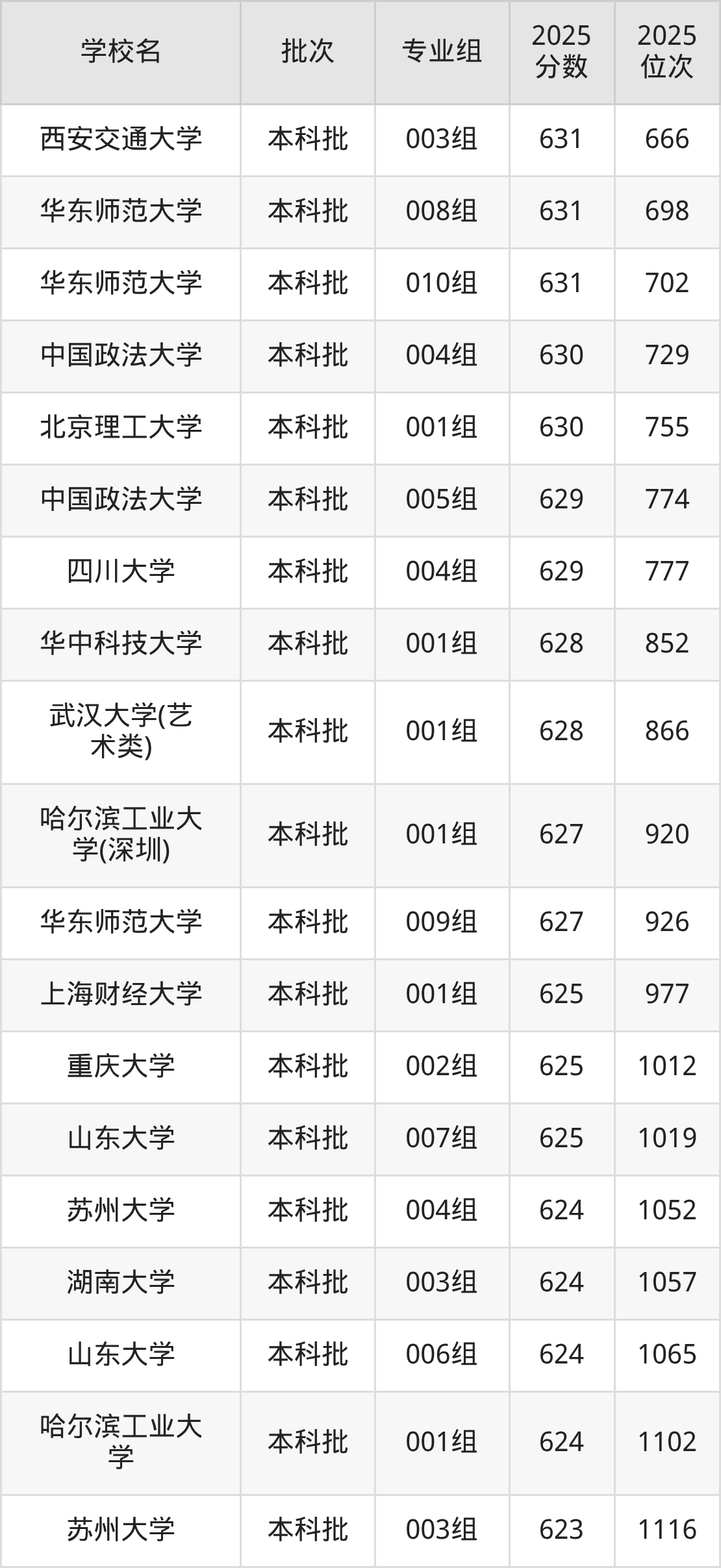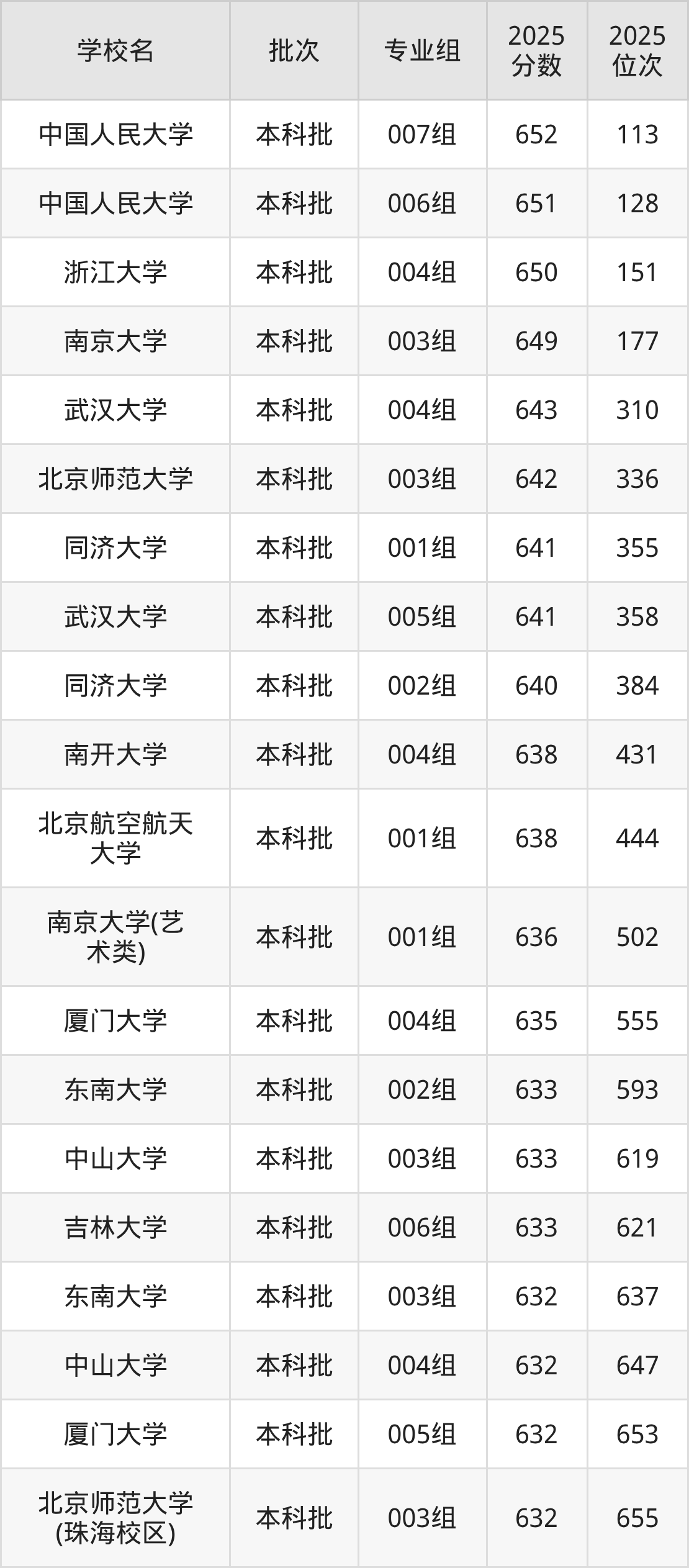 2025年安徽高考历史类633分(588名~626名)能上的大学有东南大学002组、吉林大学006组、中山大学003组。