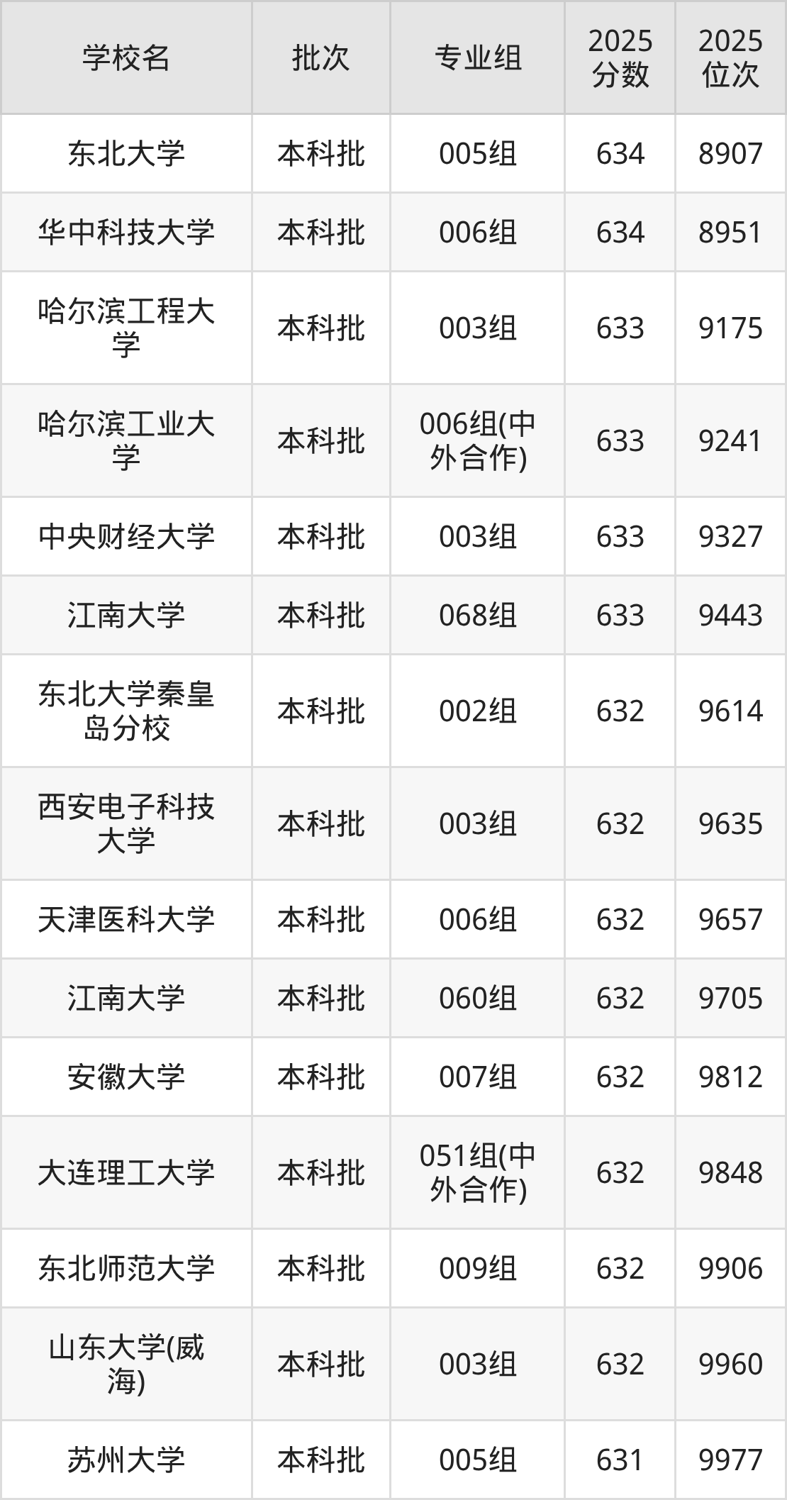 2025年安徽高考物理类633分(9172名~9530名)能上的大学有哈尔滨工程大学003组、哈尔滨工业大学006组(中外合作)、江南大学068组、中央财经大学003组。