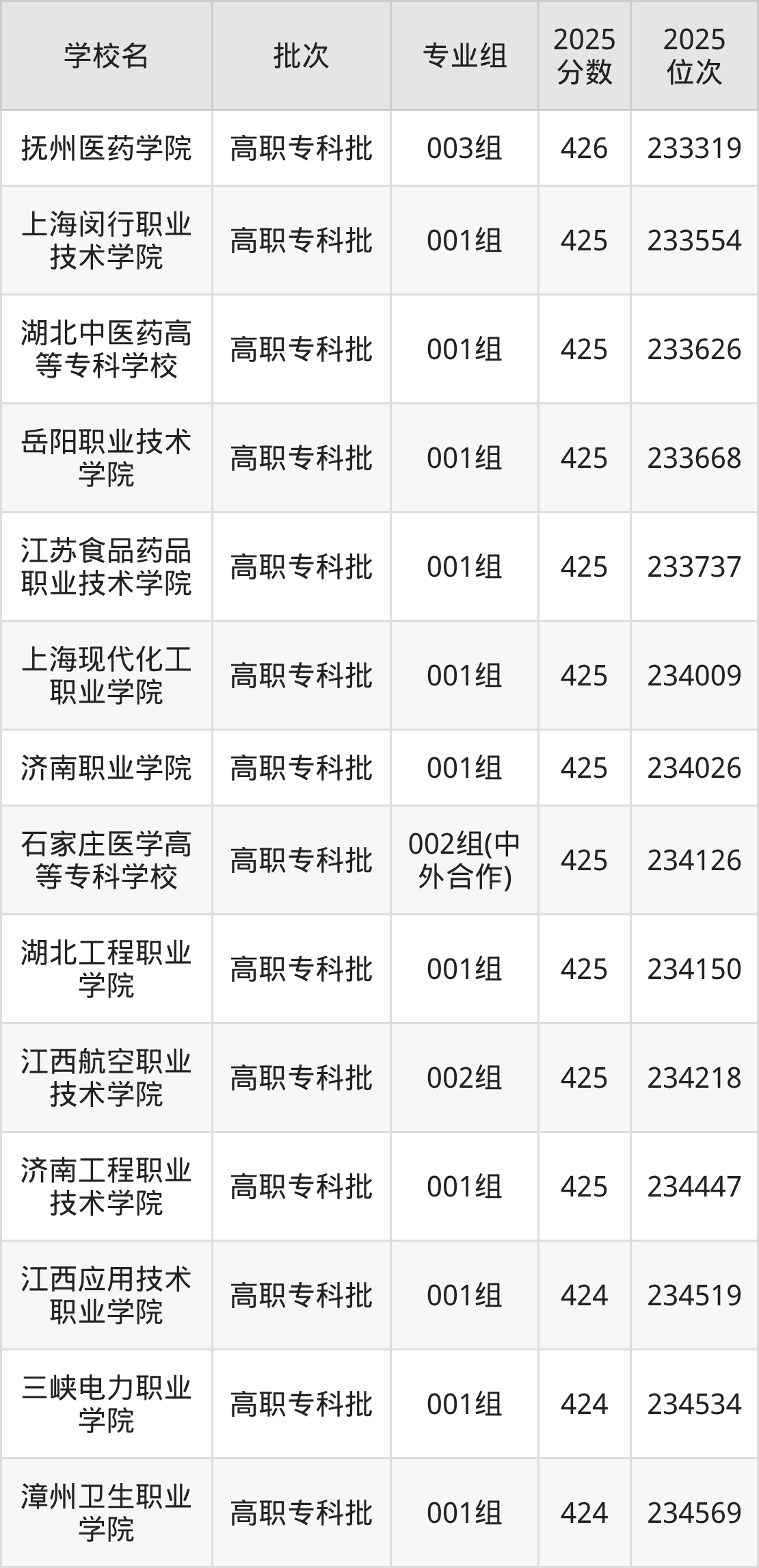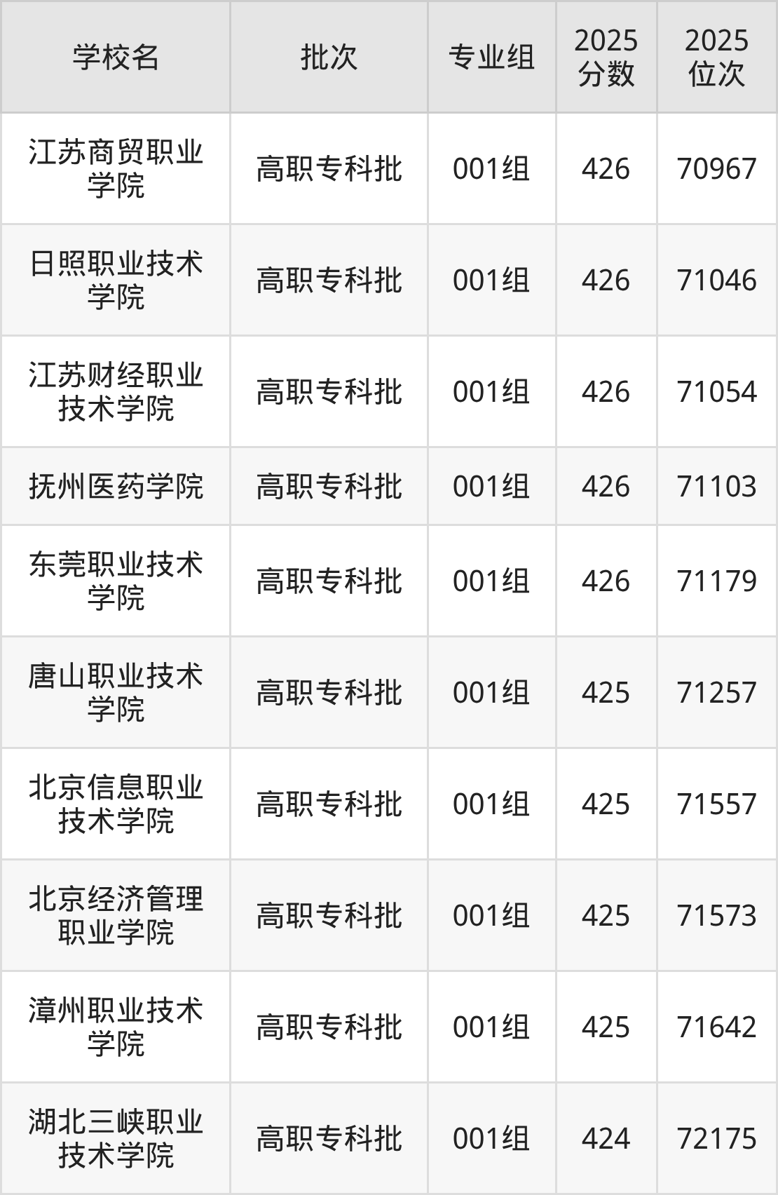 2025年安徽高考历史类425分(71231名~71715名)能上的大学有北京经济管理职业学院001组、北京信息职业技术学院001组、唐山职业技术学院001组、漳州职业技术学院001组。