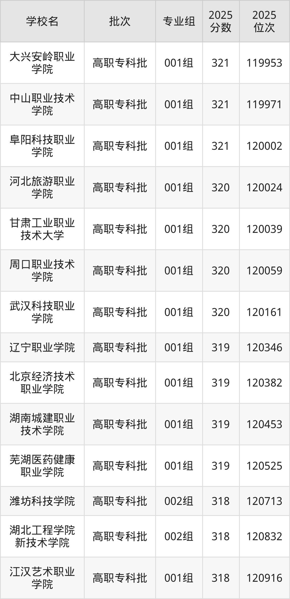 2025年安徽高考历史类319分(120317名~120604名)能上的大学有北京经济技术职业学院001组、湖南城建职业技术学院001组、辽宁职业学院001组、芜湖医药健康职业学院001组。