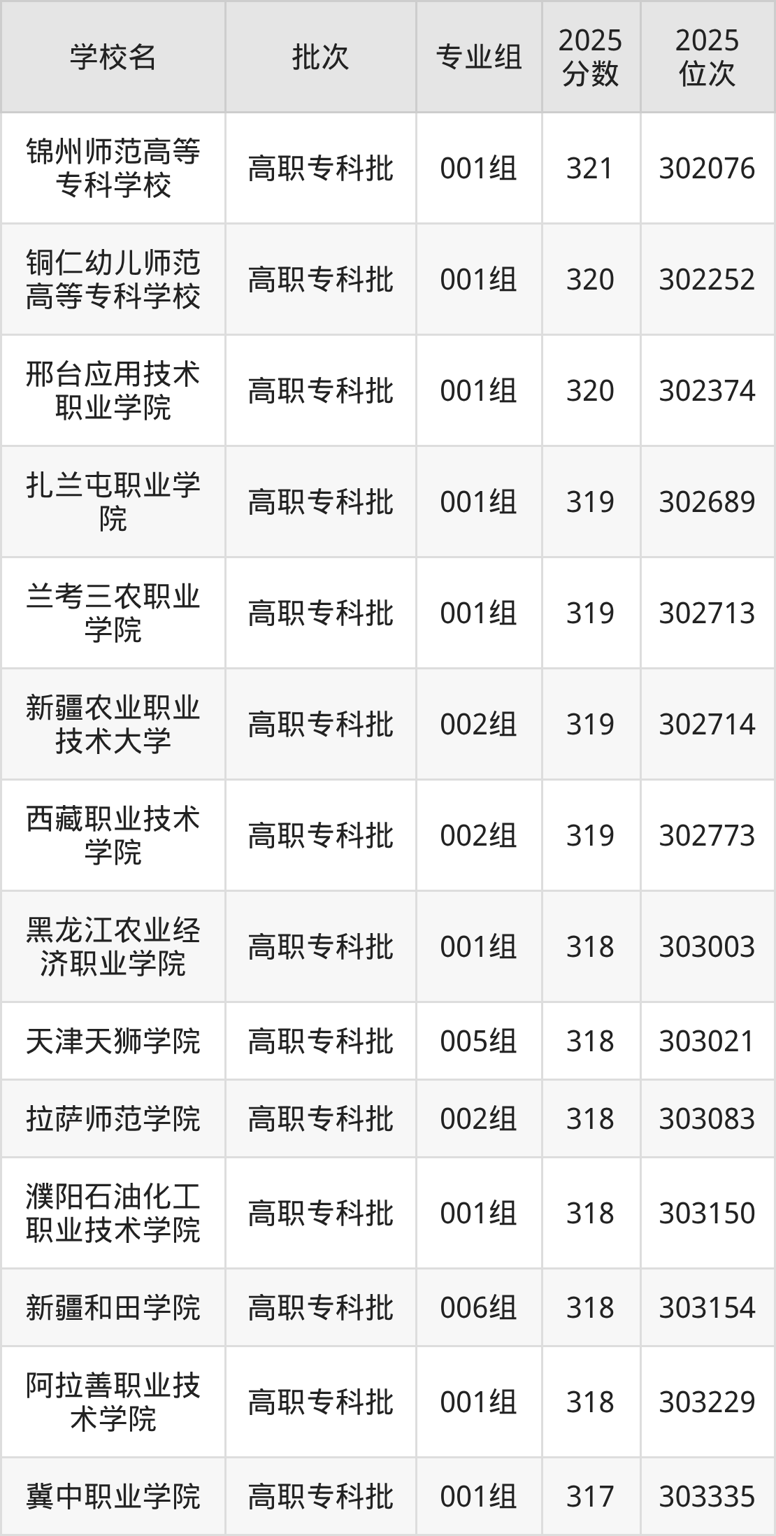 2025年安徽高考物理类319分(302571名~302912名)能上的大学有兰考三农职业学院001组、西藏职业技术学院002组、新疆农业职业技术大学002组、扎兰屯职业学院001组。