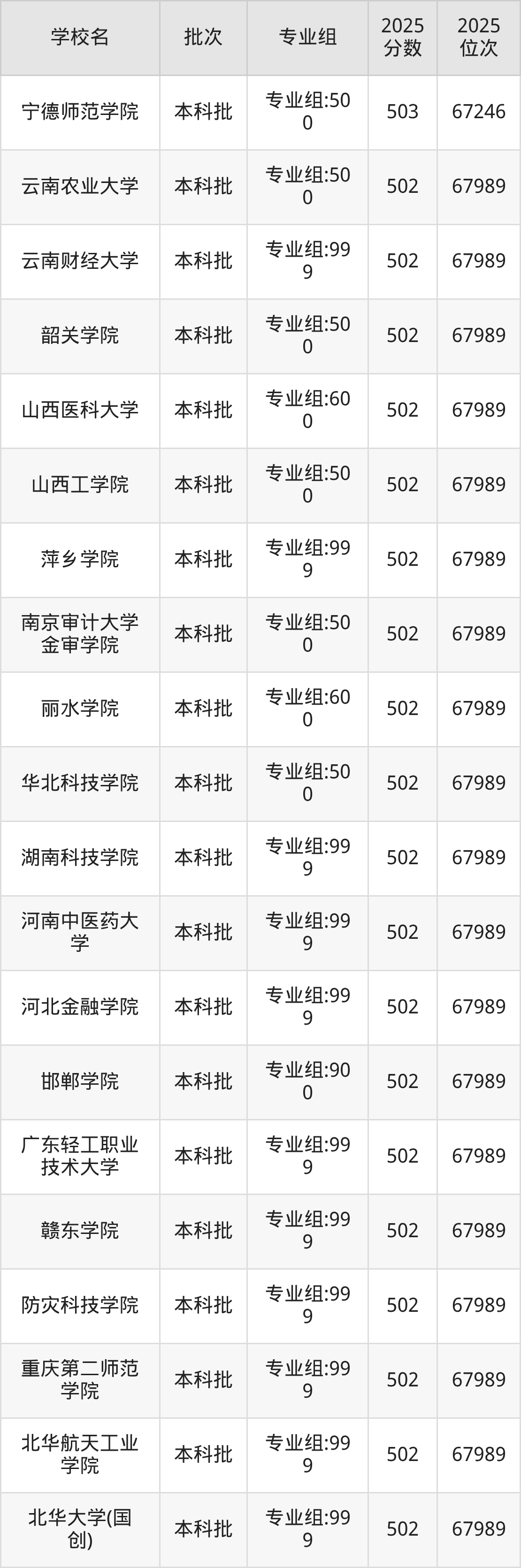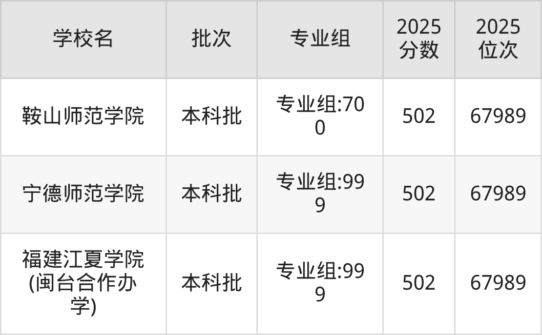 2025年福建高考物理类502分(67247名~67989名)能上的大学有福建江夏学院(闽台合作办学)专业组:999、宁德师范学院专业组:999、鞍山师范学院专业组:700、北华大学(国创)专业组:999等。