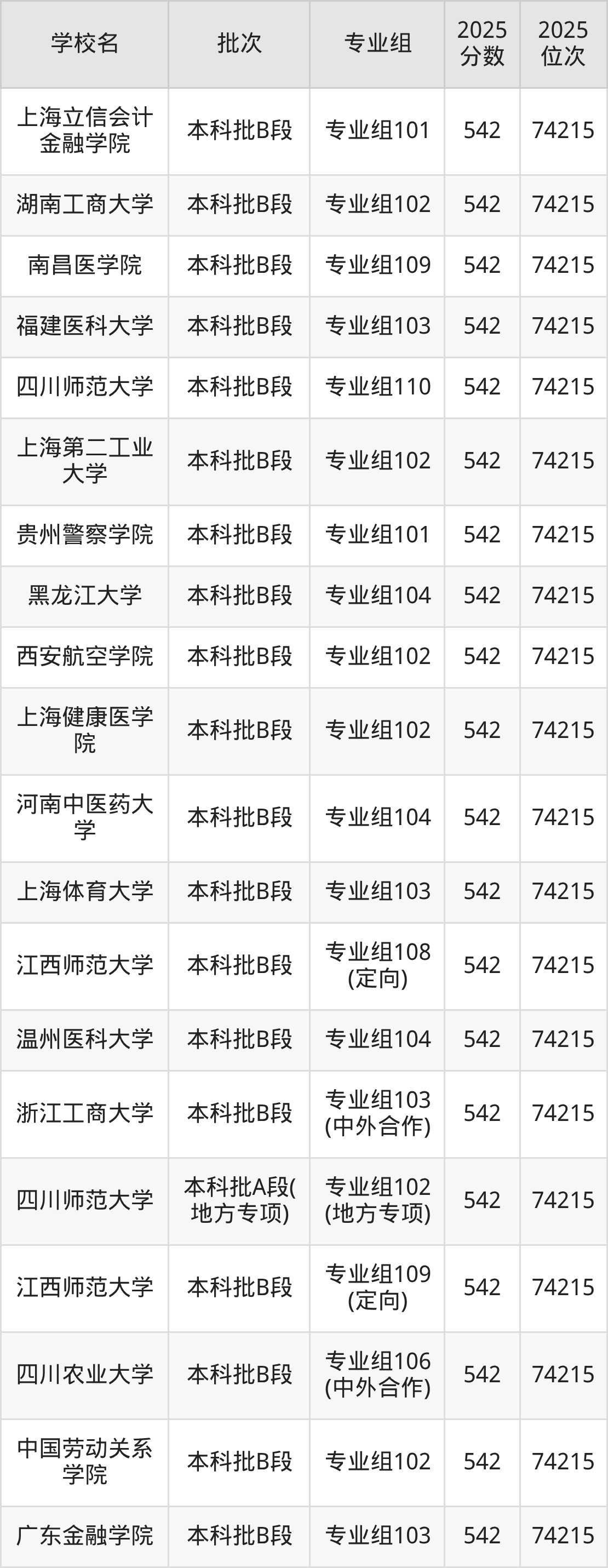 四川高考542分:历史类排名23750位、物理类排名74215位。该分数位次对应能上的大学历史类有遵义医科大学专业组101、乐山师范学院专业组105;物理类有四川师范大学专业组110、上海第二工业大学专业组102,更多名单如下文所示,2026届考生可参考。