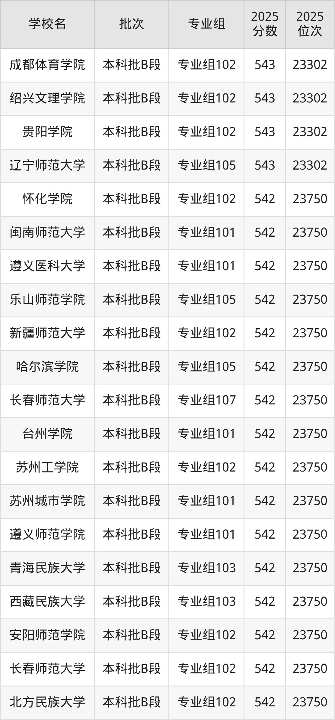 2025年四川高考历史类542分(23303名~23750名)能上的大学有遵义医科大学专业组101、乐山师范学院专业组105、新疆师范大学专业组102、苏州城市学院专业组101等。