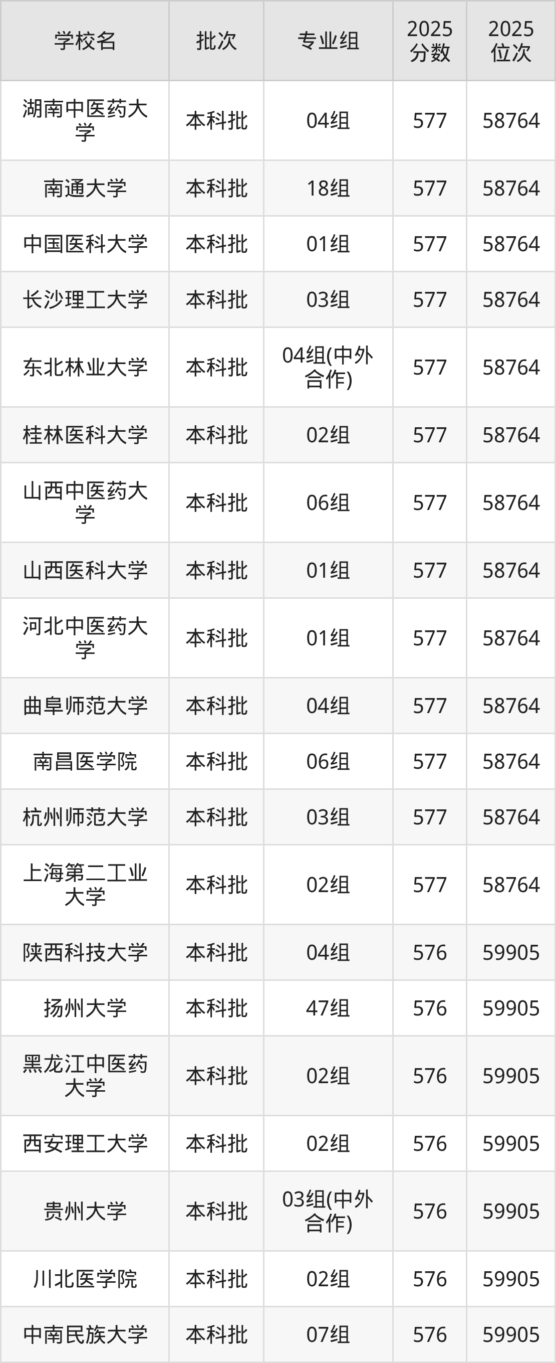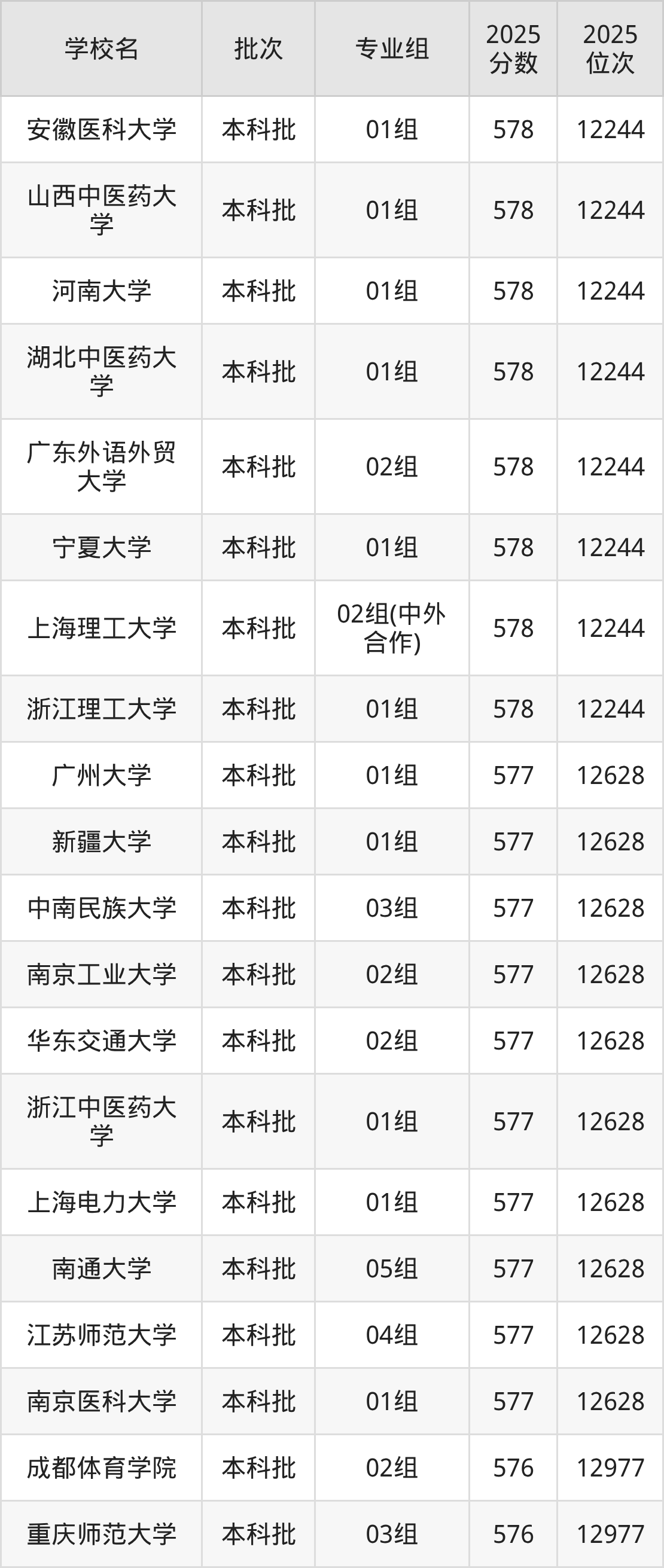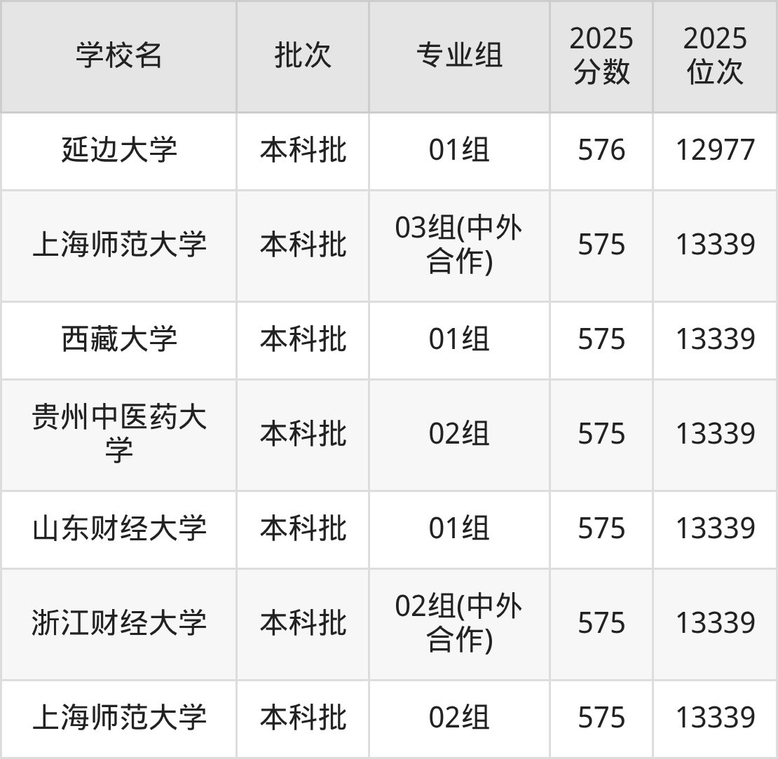 2025年江苏高考历史类576分(12629名~12977名)能上的大学有延边大学01组、成都体育学院02组、重庆师范大学03组。