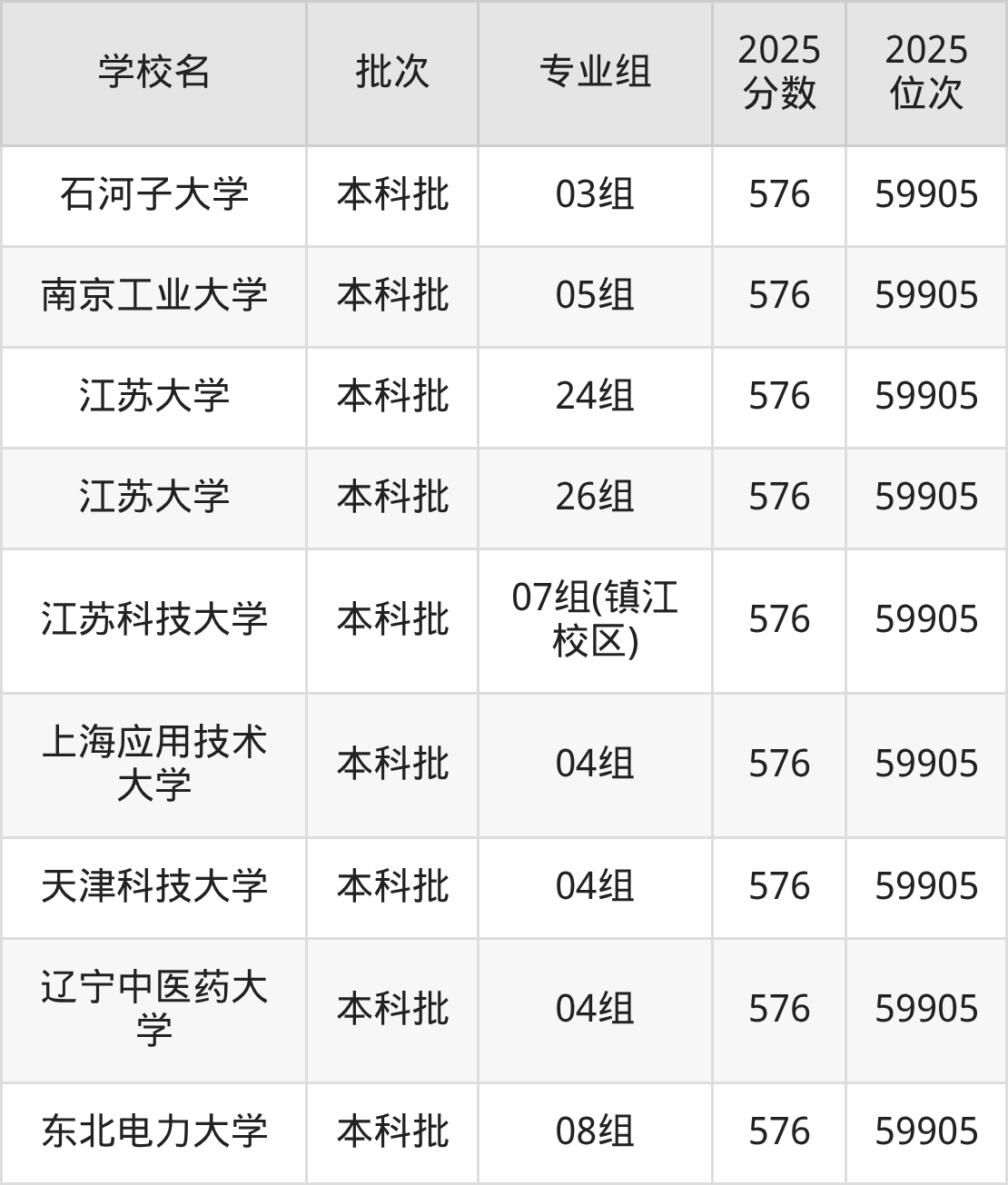 2025年江苏高考物理类576分(58765名~59905名)能上的大学有南京工业大学05组、扬州大学47组、江苏大学24组、江苏大学26组等。