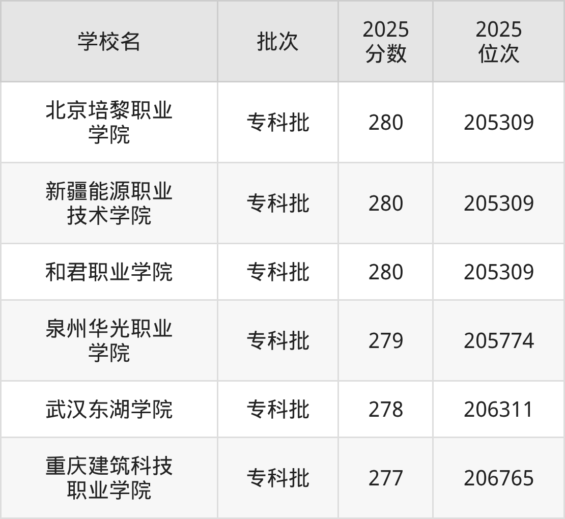 另外录取位次低于该区间(较稳妥)的有重庆建筑科技职业学院(206765名)、兰州科技职业学院(207248名)等;录取位次高于该区间(可冲)的有泉州华光职业学院(205774名)、新疆能源职业技术学院(205309名)等。