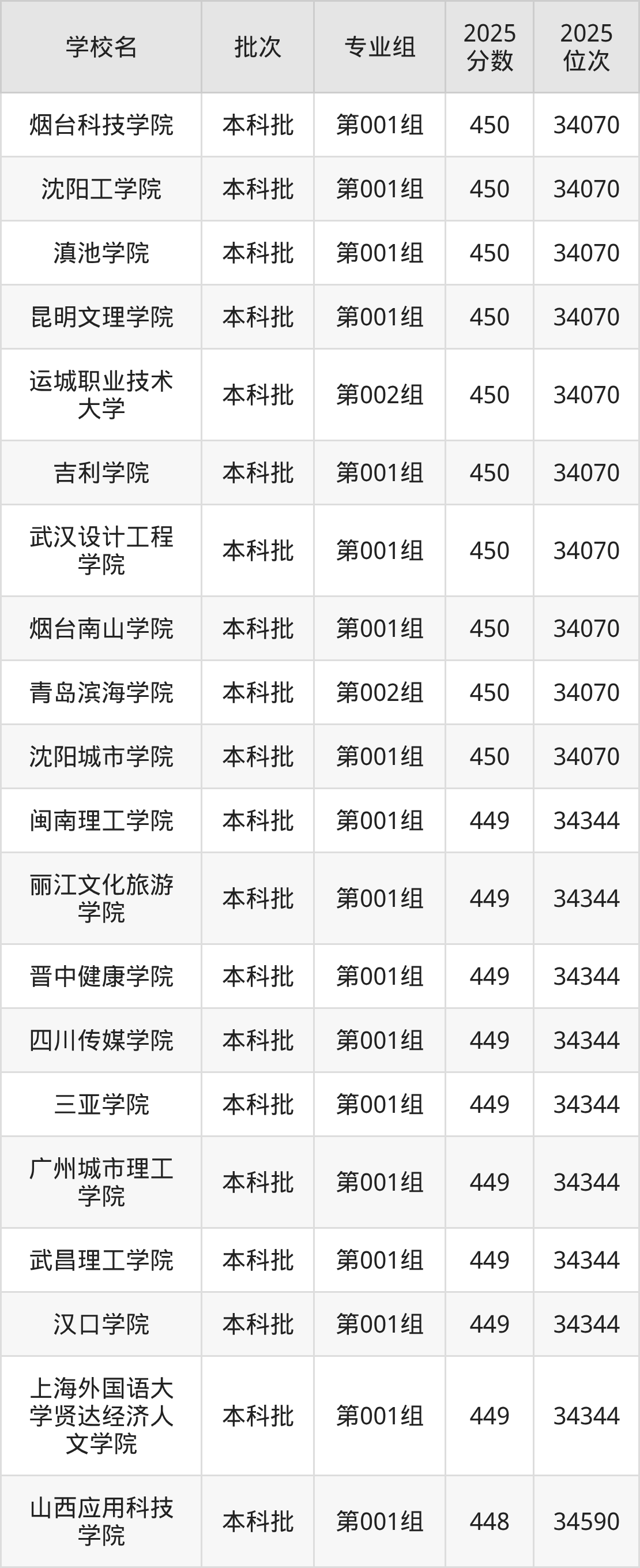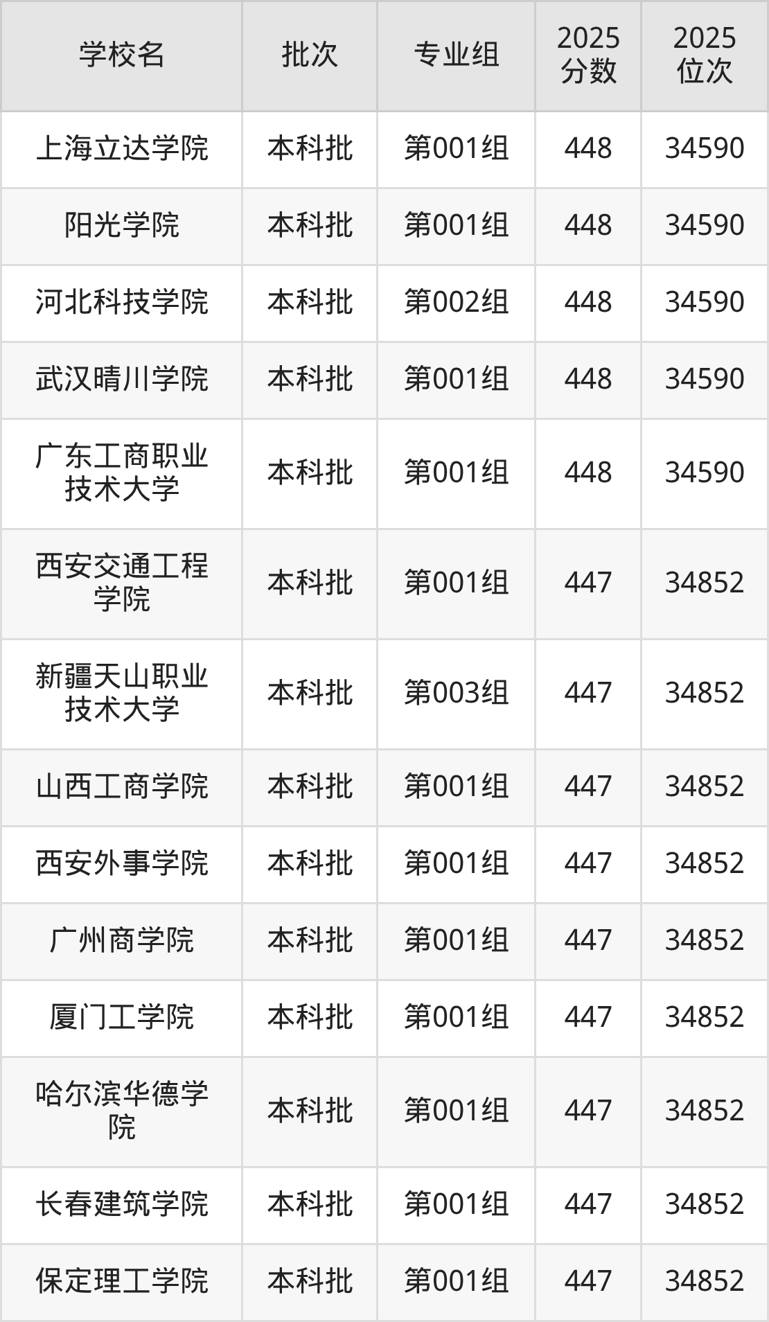 2025年山西高考历史类448分(34345名~34590名)能上的大学有河北科技学院第002组、上海立达学院第001组、阳光学院第001组、武汉晴川学院第001组等。