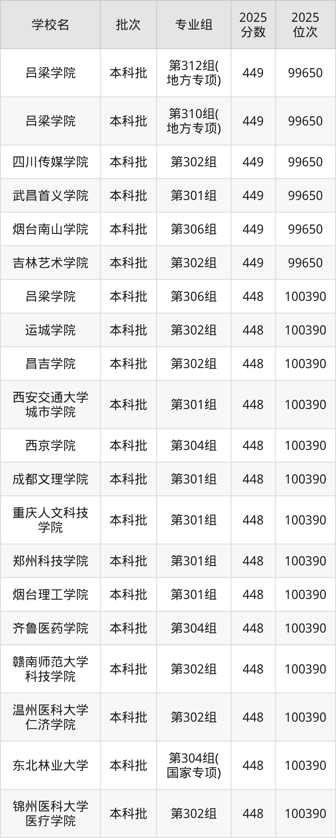 2025年山西高考物理类448分(99651名~100390名)能上的大学有沈阳农业大学第301组、锦州医科大学医疗学院第302组、东北林业大学第304组(国家专项)、温州医科大学仁济学院第302组等。