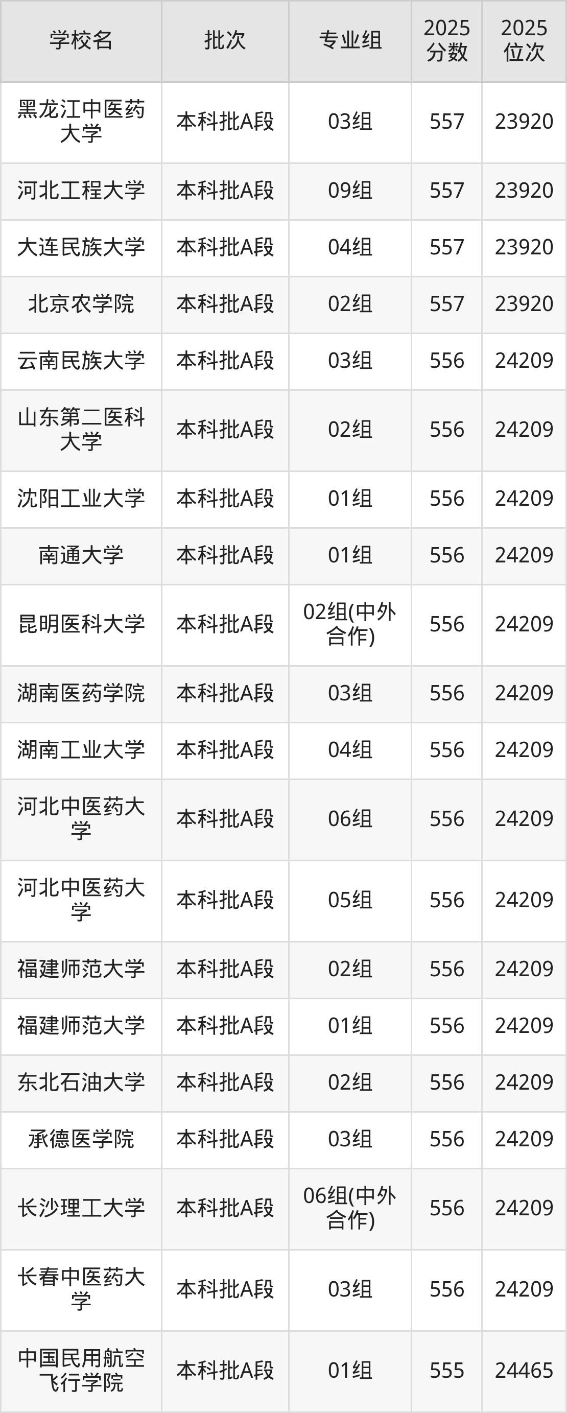 2025年天津高考556分(23921名~24209名)能上的大学有长春中医药大学03组、长沙理工大学06组(中外合作)、承德医学院03组、东北石油大学02组等。