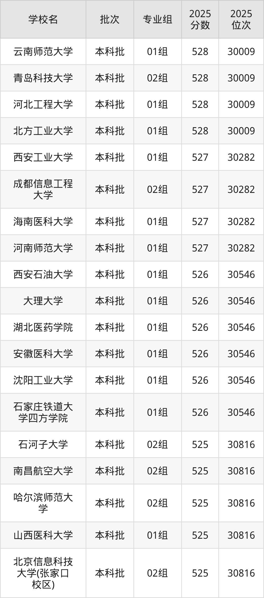 这些都是2026年高考30283名~30546名考生可以报考的大学,更多学校名单如下表所示: