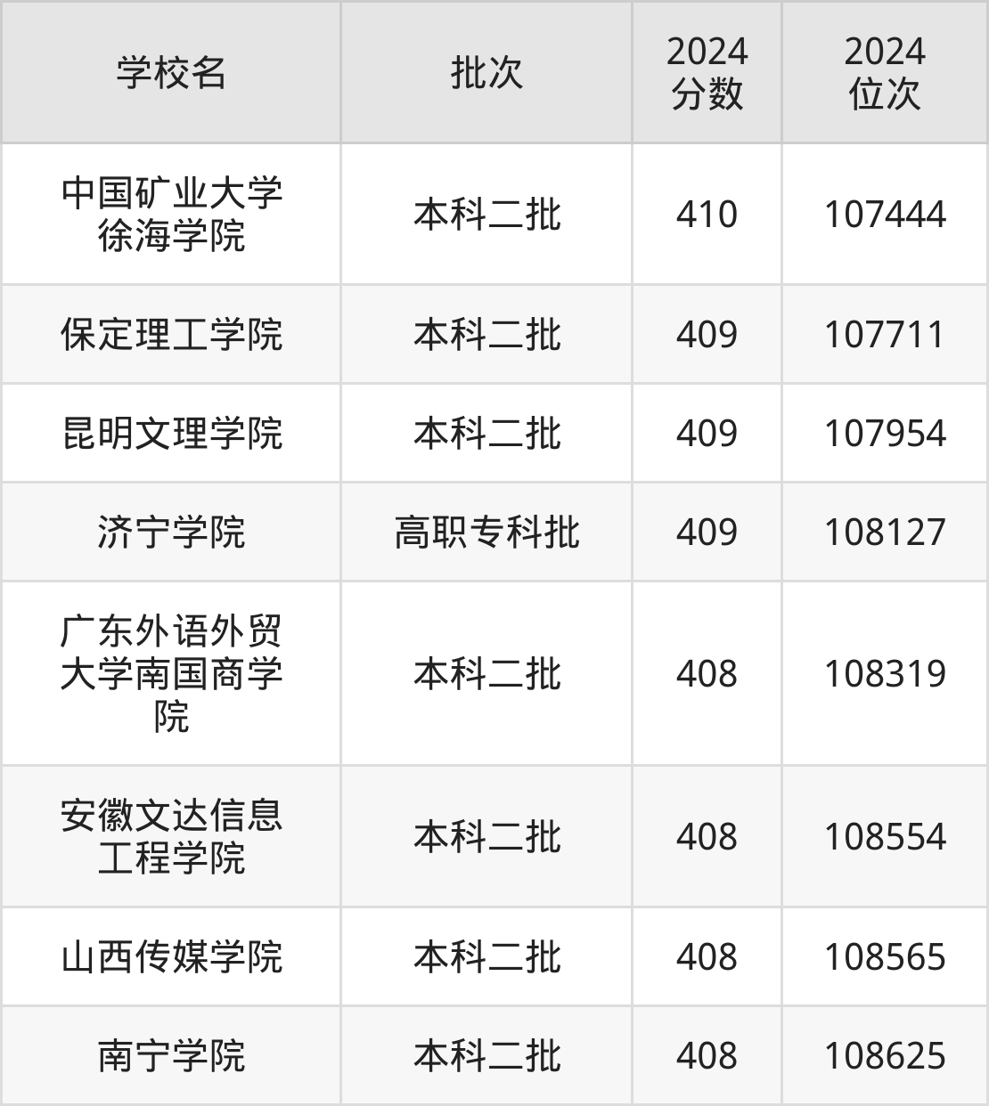 这些都是2025年高考理科107538名~108248名考生可以报考的大学,更多学校名单如下表所示: