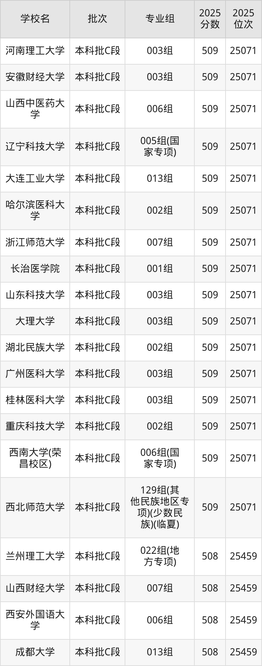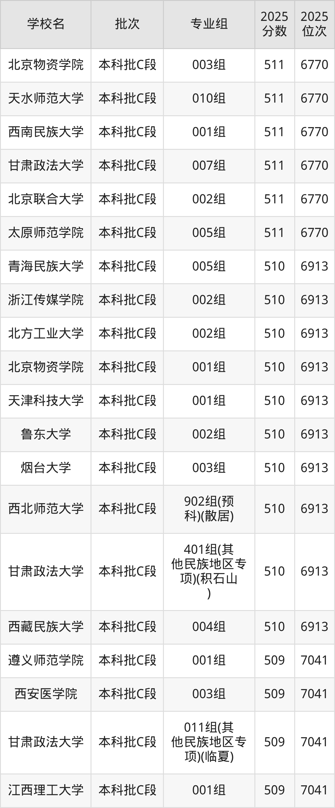 2025年甘肃高考历史类509分(6914名~7041名)能上的大学有太原师范学院006组、大连外国语大学001组、江西理工大学001组、遵义师范学院001组等。