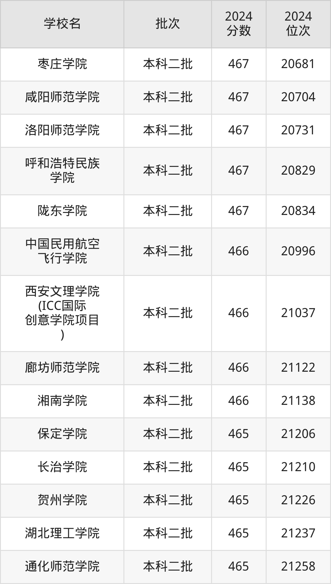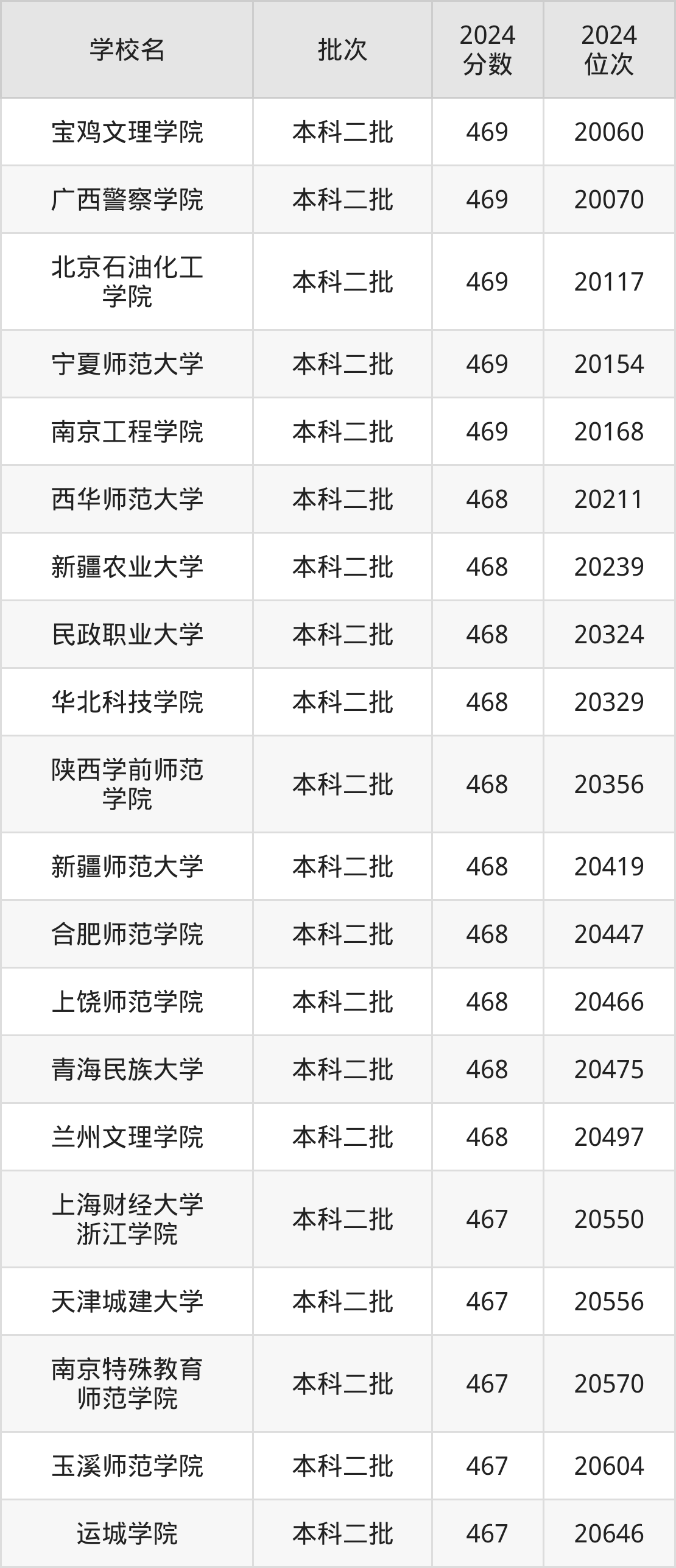 2024年陕西高考文科467分(20505名~20835名)能上的大学有天津城建大学、运城学院、呼和浩特民族学院、南京特殊教育师范学院等。
