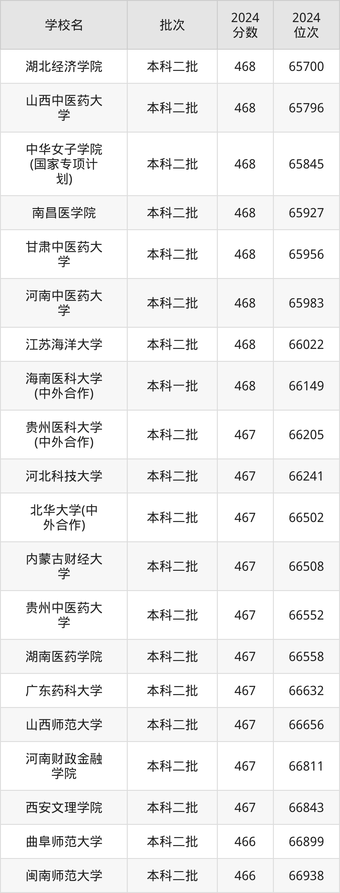 2024年陕西高考理科467分(66150名~66861名)能上的大学有河北科技大学、山西师范大学、内蒙古财经大学、湖南医药学院等。