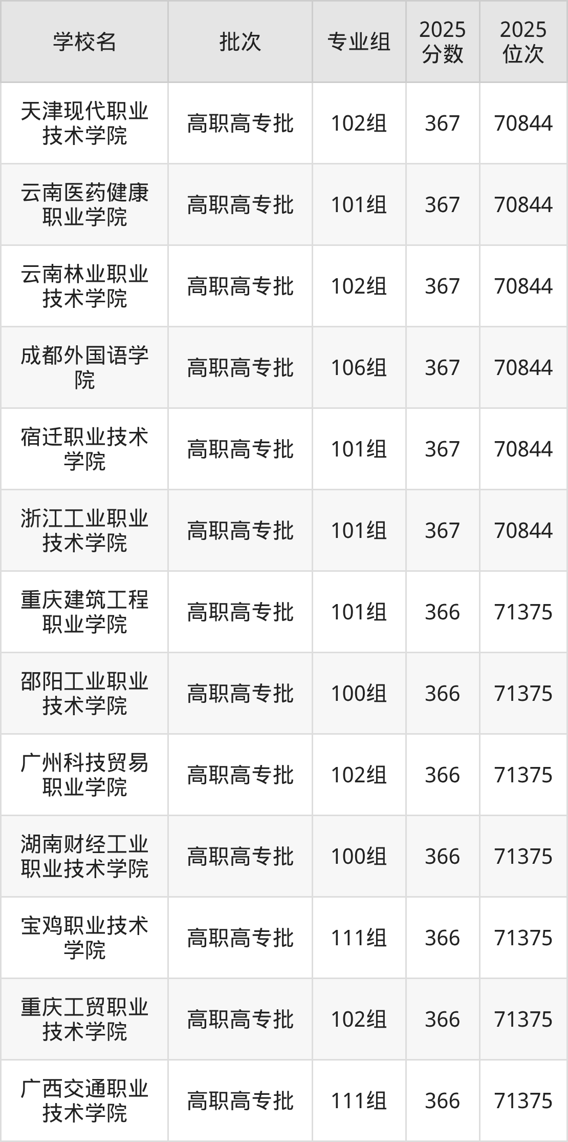 2025年广西高考历史类366分(70845名~71375名)能上的大学有广西交通职业技术学院111组、重庆工贸职业技术学院102组、宝鸡职业技术学院111组、湖南财经工业职业技术学院100组等。