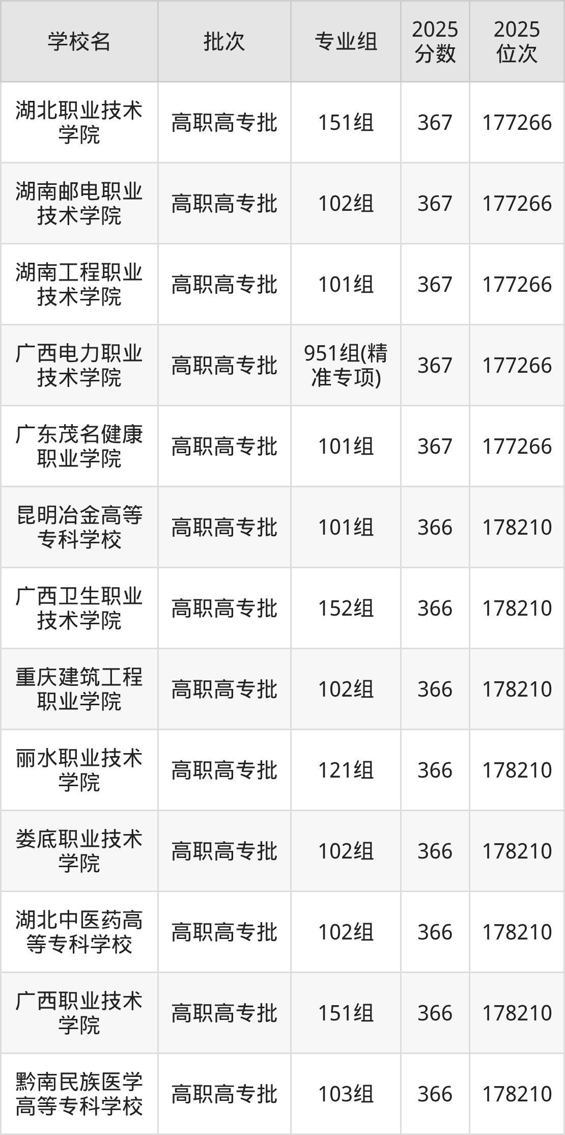 2025年广西高考物理类366分(177267名~178210名)能上的大学有昆明冶金高等专科学校101组、黔南民族医学高等专科学校103组、广西职业技术学院151组、湖北中医药高等专科学校102组等。