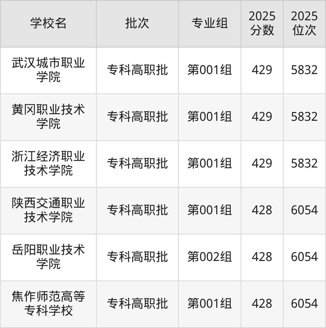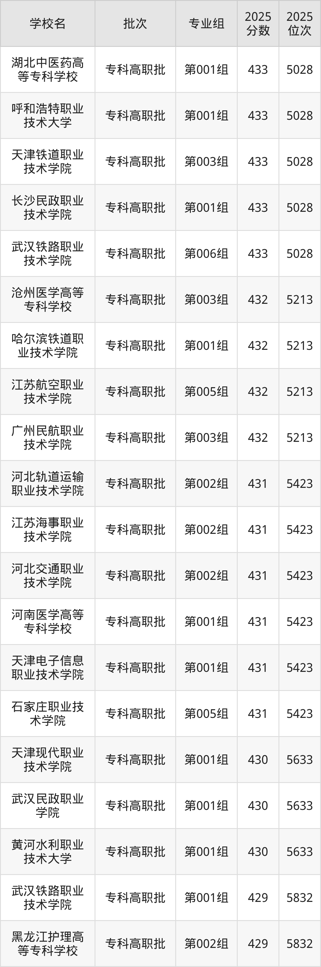 2025年山西高考历史类430分(5424名~5633名)能上的大学有天津现代职业技术学院第001组、黄河水利职业技术大学第001组、武汉民政职业学院第001组。