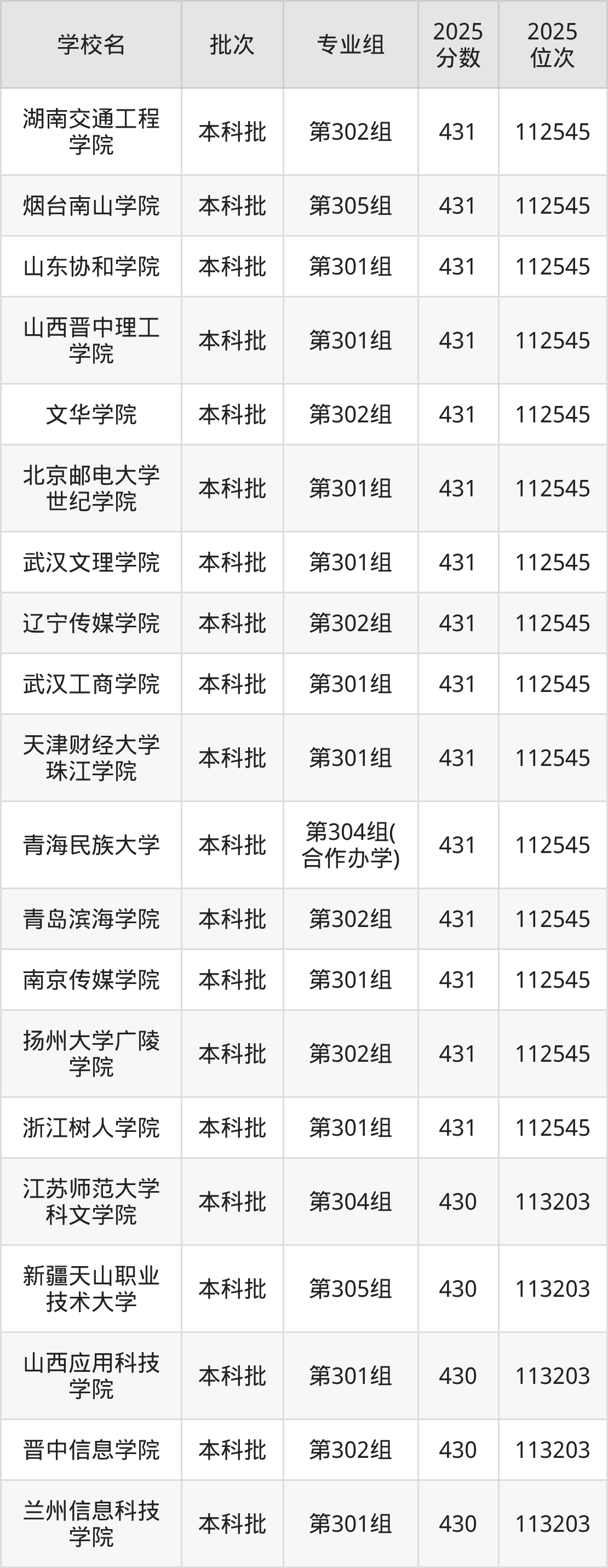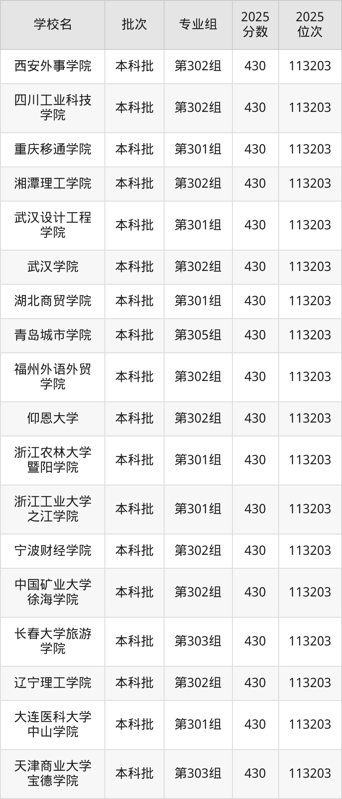 2025年山西高考物理类430分(112546名~113203名)能上的大学有天津商业大学宝德学院第303组、大连医科大学中山学院第301组、辽宁理工学院第302组、长春大学旅游学院第303组等。