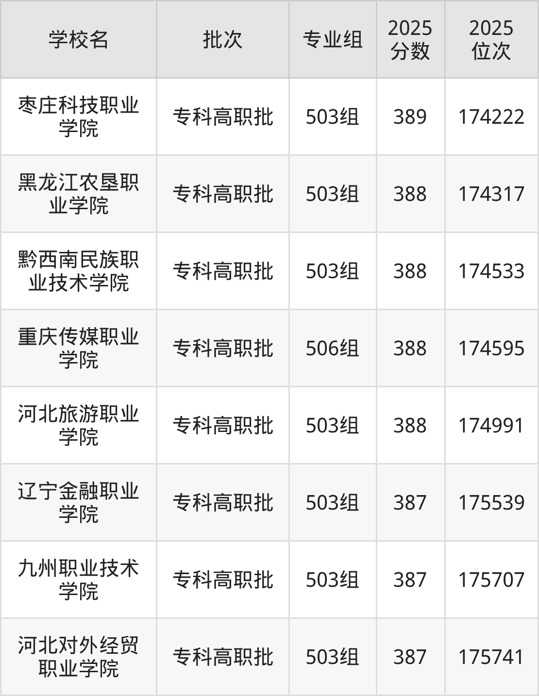 2025年广东高考历史类388分(174291名~175413名)能上的大学有黑龙江农垦职业学院503组、重庆传媒职业学院506组、河北旅游职业学院503组、黔西南民族职业技术学院503组。