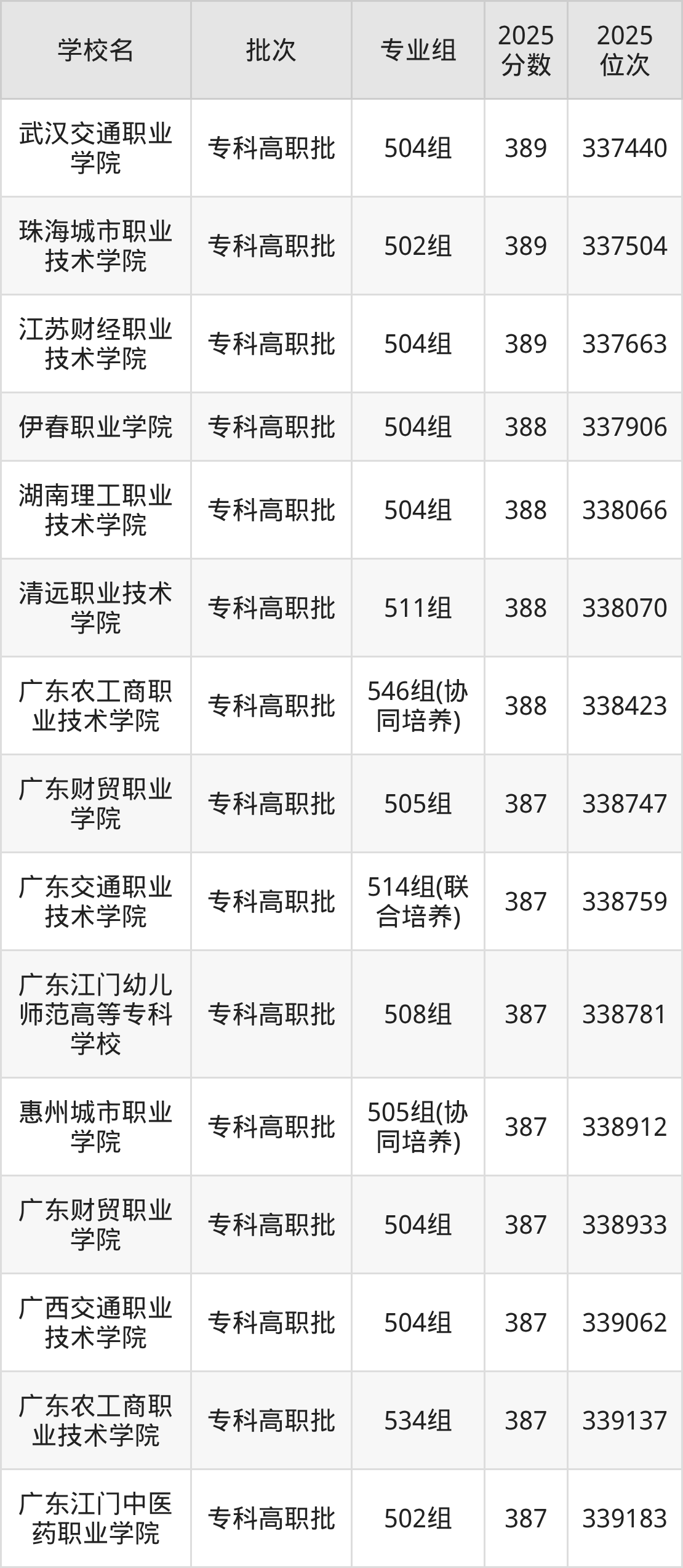 另外录取位次低于该区间(较稳妥)的有广东财贸职业学院505组(338747名)、广东交通职业技术学院514组(联合培养)(338759名)等;录取位次高于该区间(可冲)的有江苏财经职业技术学院504组(337663名)、珠海城市职业技术学院502组(337504名)等。