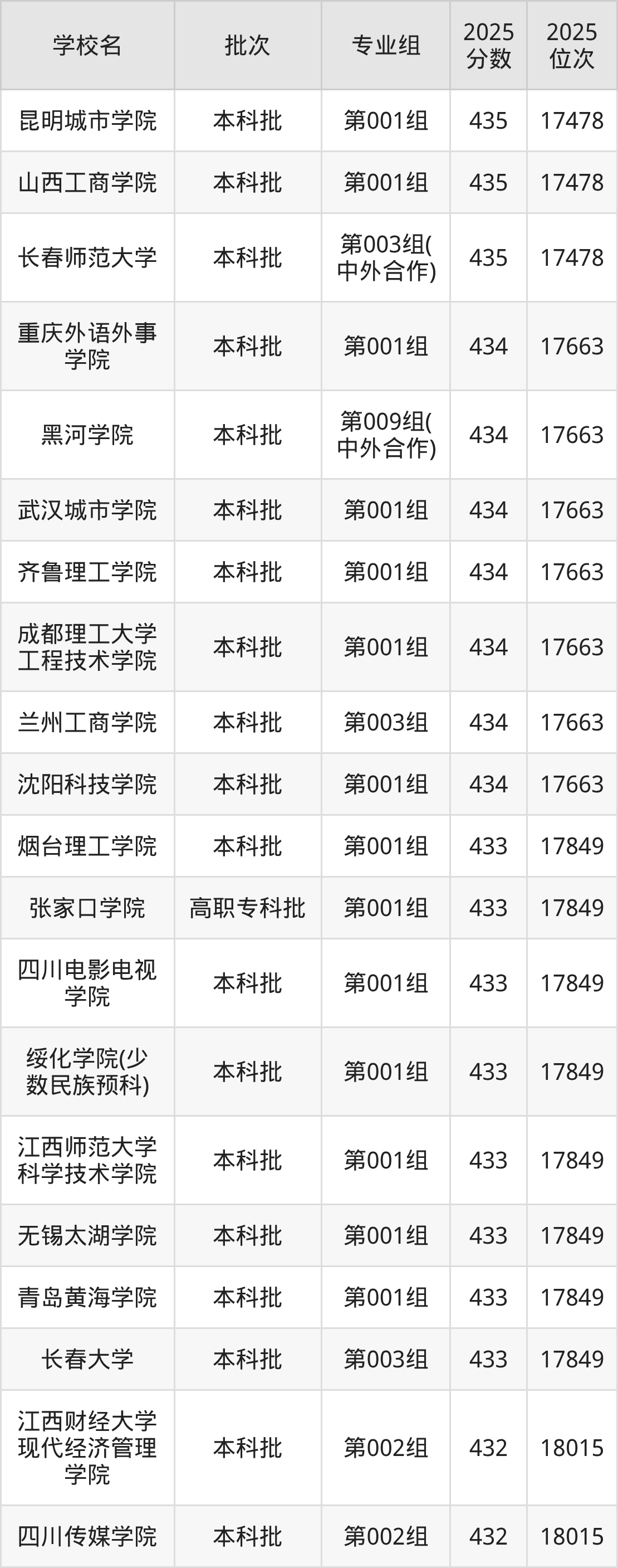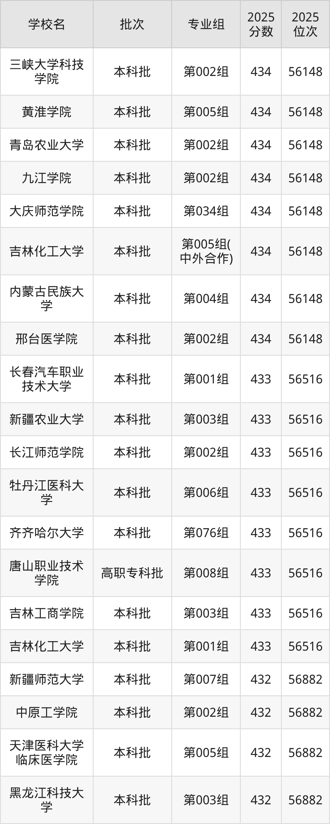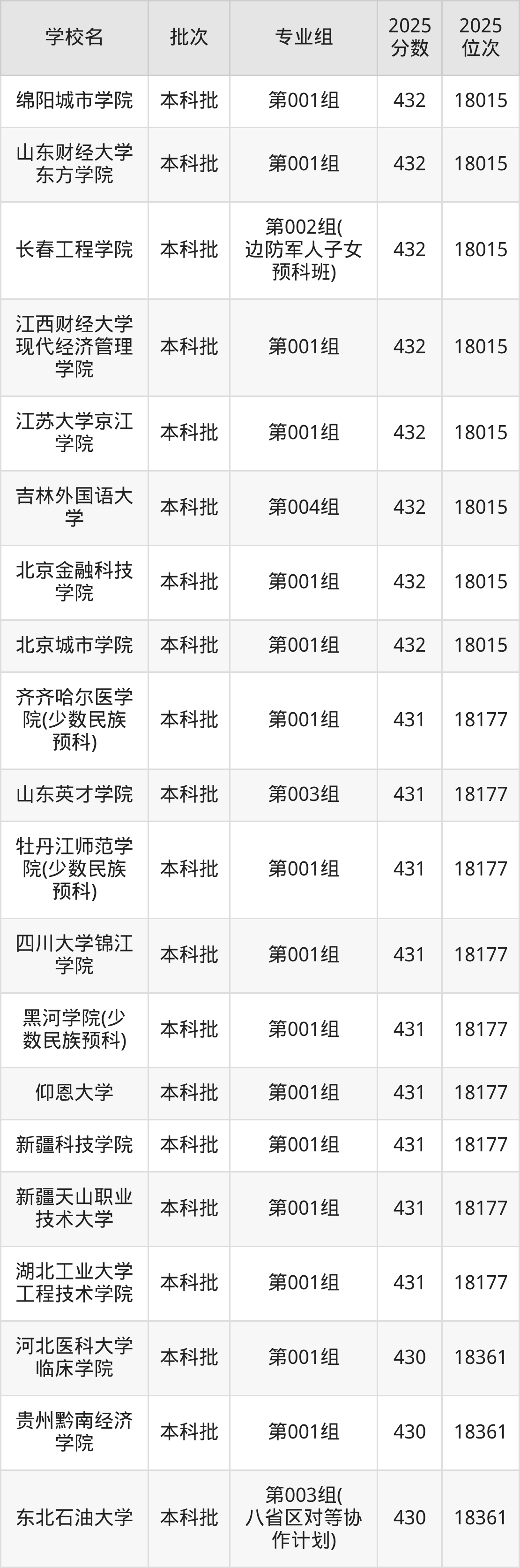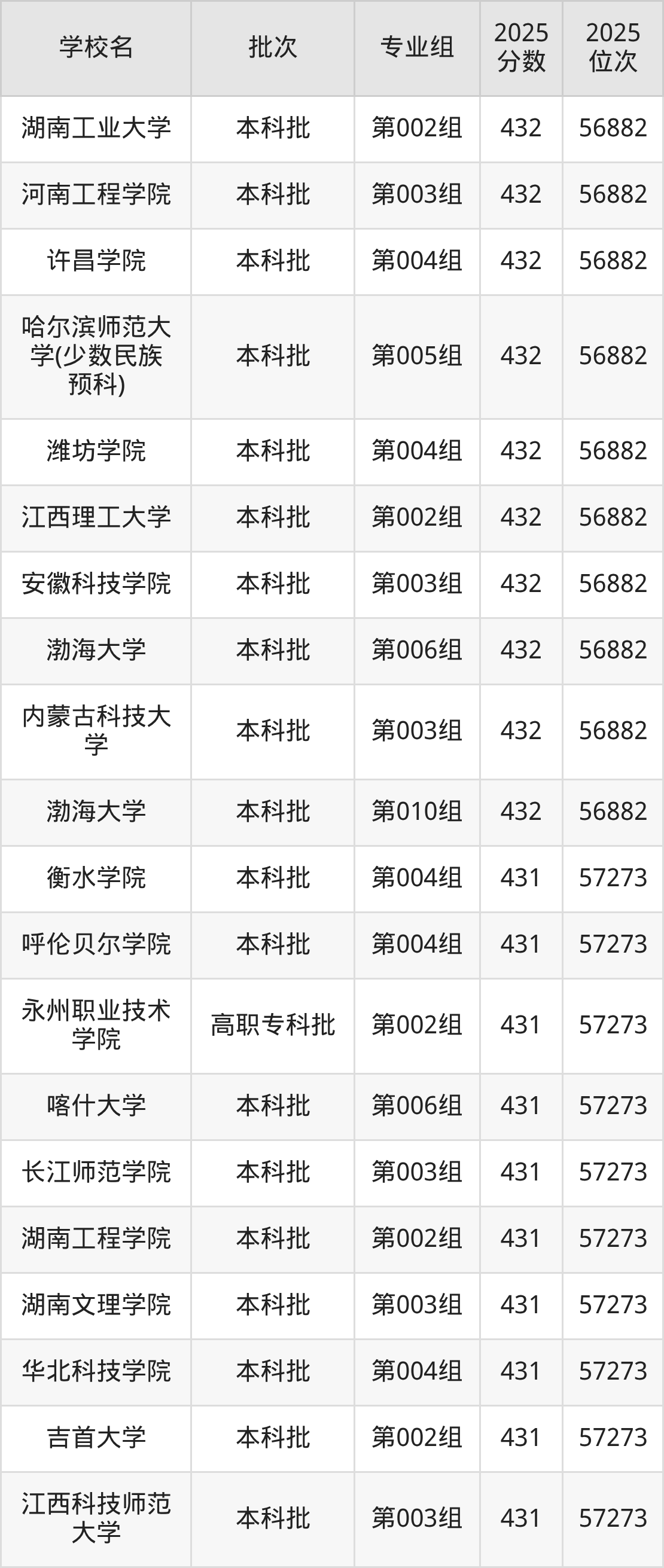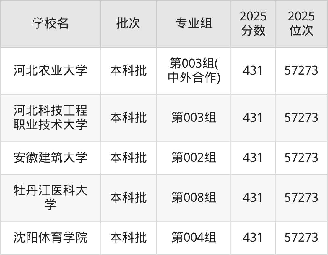 2025年黑龙江高考历史类432分(17850名~18015名)能上的大学有长春工程学院第002组(边防军人子女预科班)、北京城市学院第001组、北京金融科技学院第001组、吉林外国语大学第004组等。