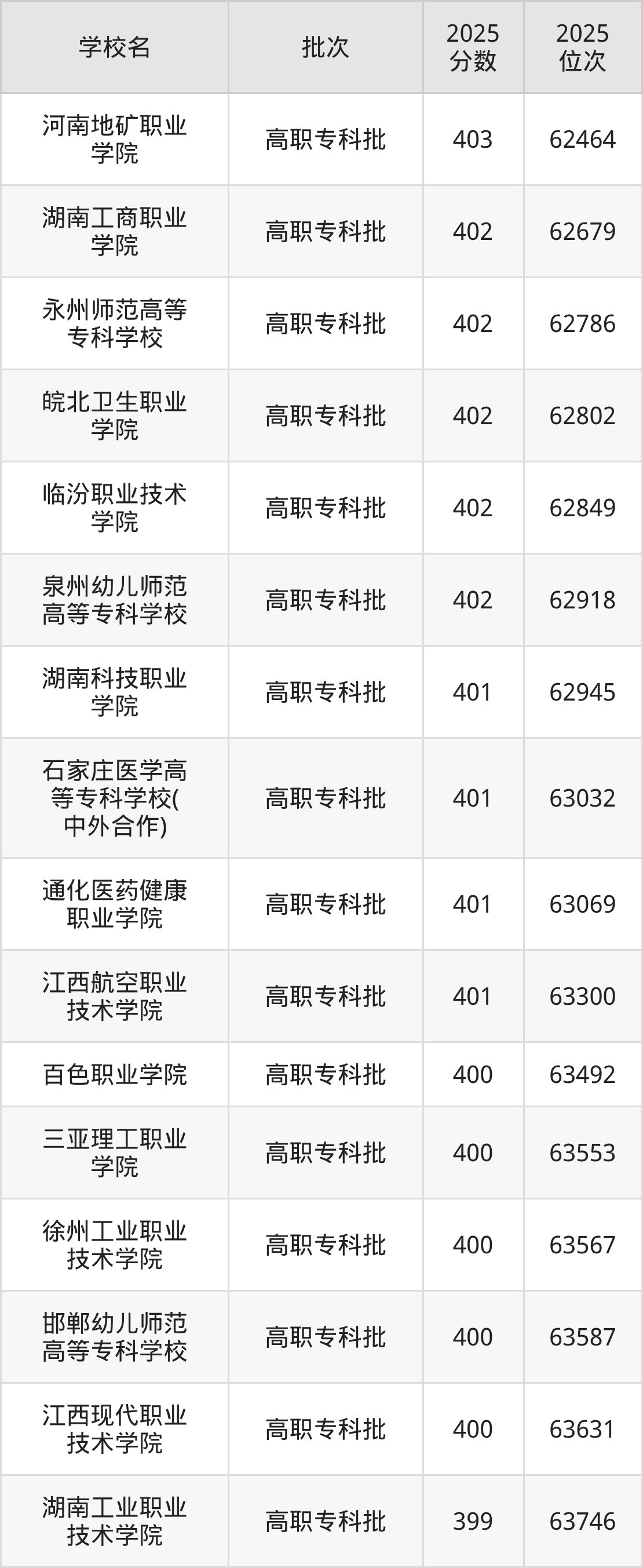 2025年贵州高考历史类401分(62941名~63323名)能上的大学有湖南科技职业学院、通化医药健康职业学院、江西航空职业技术学院、石家庄医学高等专科学校(中外合作)。